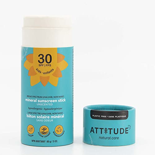 ATTITUDE Sunscreen Stick for Baby and Kids, Broad Spectrum UVA/UVB, Plastic-free, Hypoallergenic, Plant and Mineral-Based Formula, Vegan and Cruelty-free Sun Care Products, SPF 30, Unscented, 85 grams