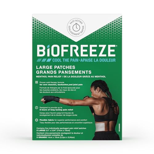 Biofreeze Patches (5 Large Size), Penetrating Pain Relief for Sore Muscles, Arthritis, Backaches, and Sore Joints, Fast Acting, Long Lasting, Cooling Menthol Formula, Mess Free Application, Flexible Fabric for Comfort,