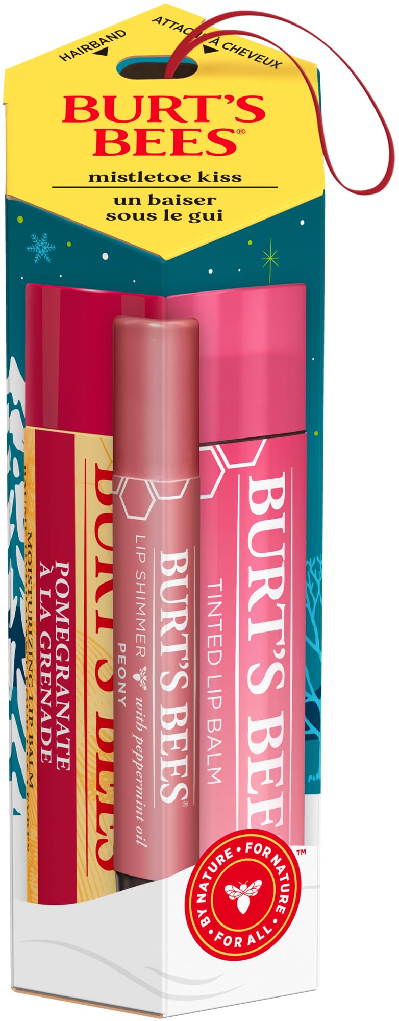 Burt's Bees Mistletoe Kiss Set, 3 Lip Products, Pomegranate Moisturizing Lip Balm, Peony Lip Shimmer and Hibiscus Tinted Lip Balm, 3 Assorted Products, Christmas Gifts, Stocking Stuffer