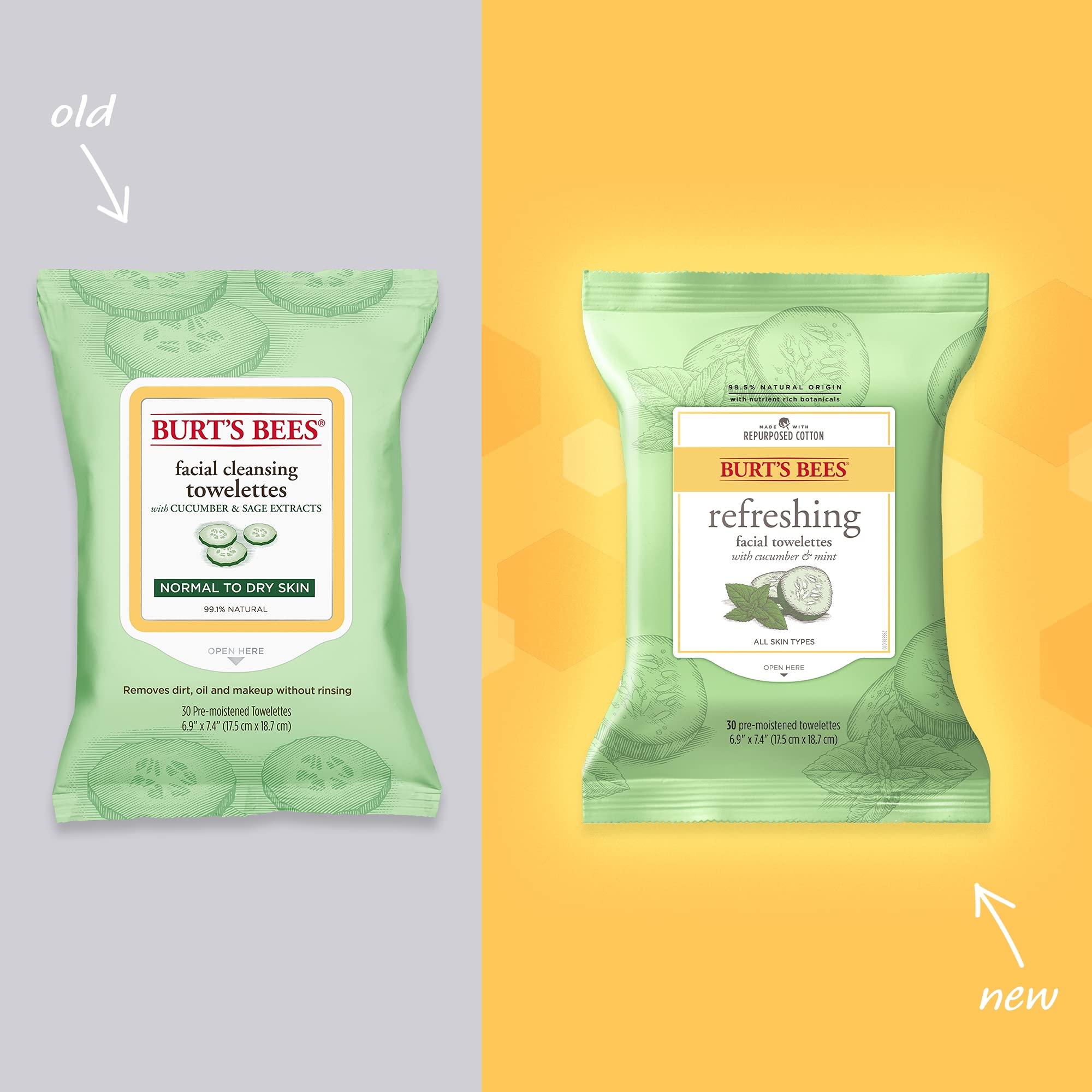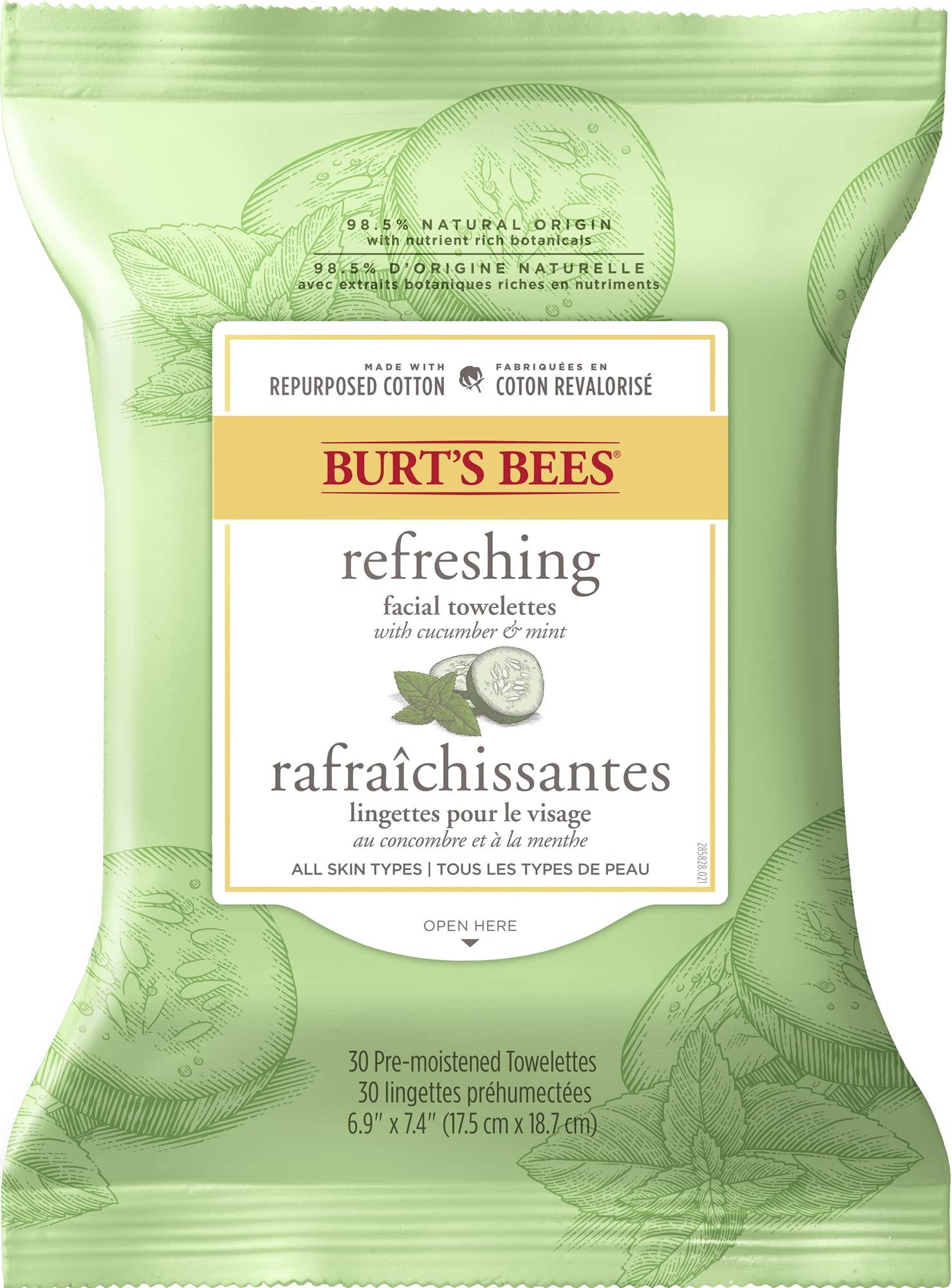 Burt's Bees Refreshing Facial Cleanser Towelettes and Makeup Remover Wipes for All Skin Types with Cucumber & Mint Made with Repurposed Cotton, 30 Count