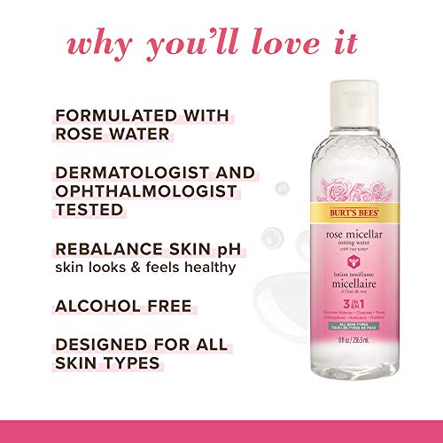 Burt's Bees Rose Micellar Toning Water, 3 in 1 Face Cleanser, Makeup Remover and Toner for all skin types , Alcohol Free, Dermatologist Tested, 1 Count