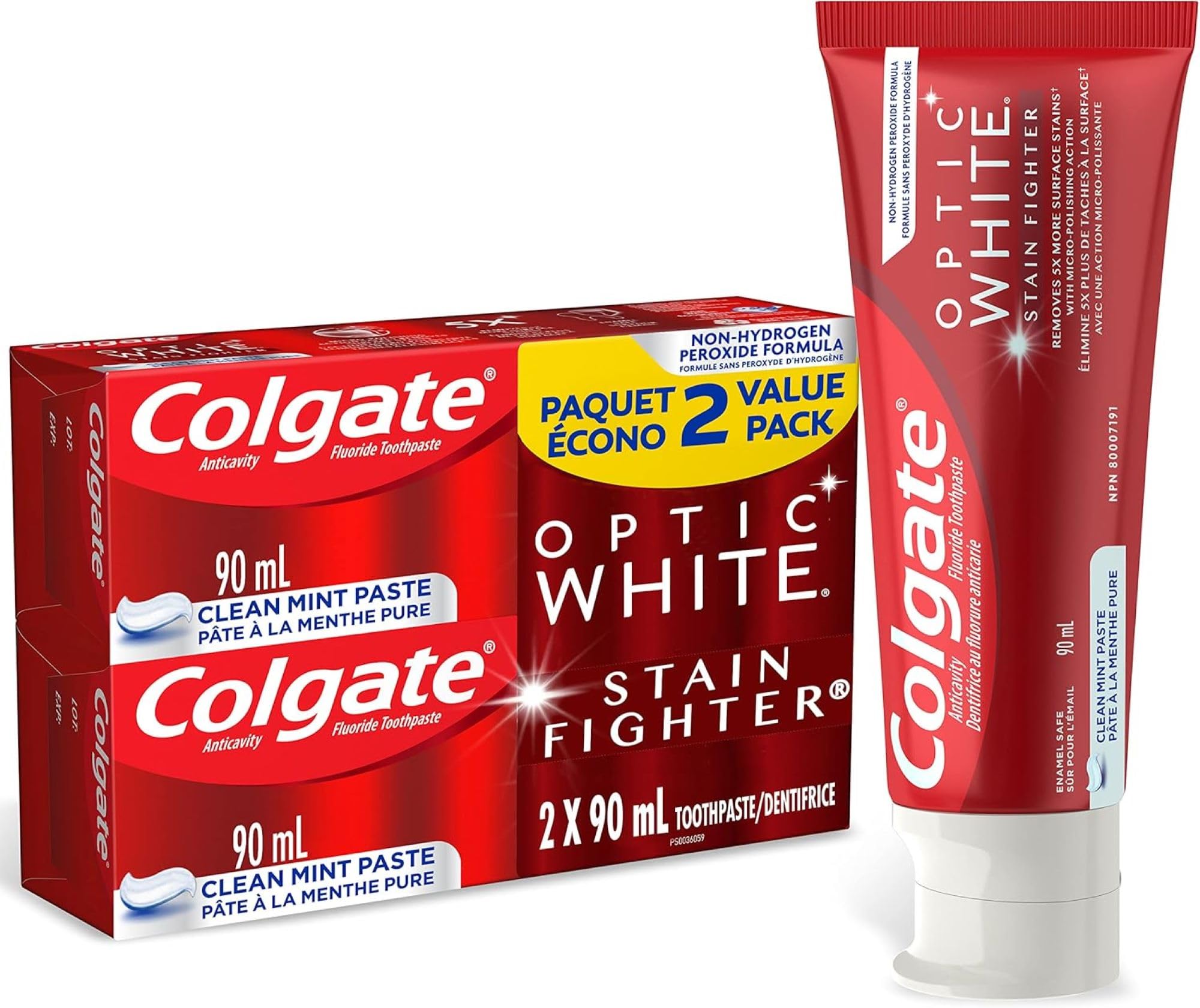 Colgate Optic White Stain Fighter Gel Toothpaste 90 mL, 2-Pack - Powerful Whitening, Enamel Safe Formula for Stain Removal & Fresh Breath - Clean Mint Flavor for Radiant Smiles