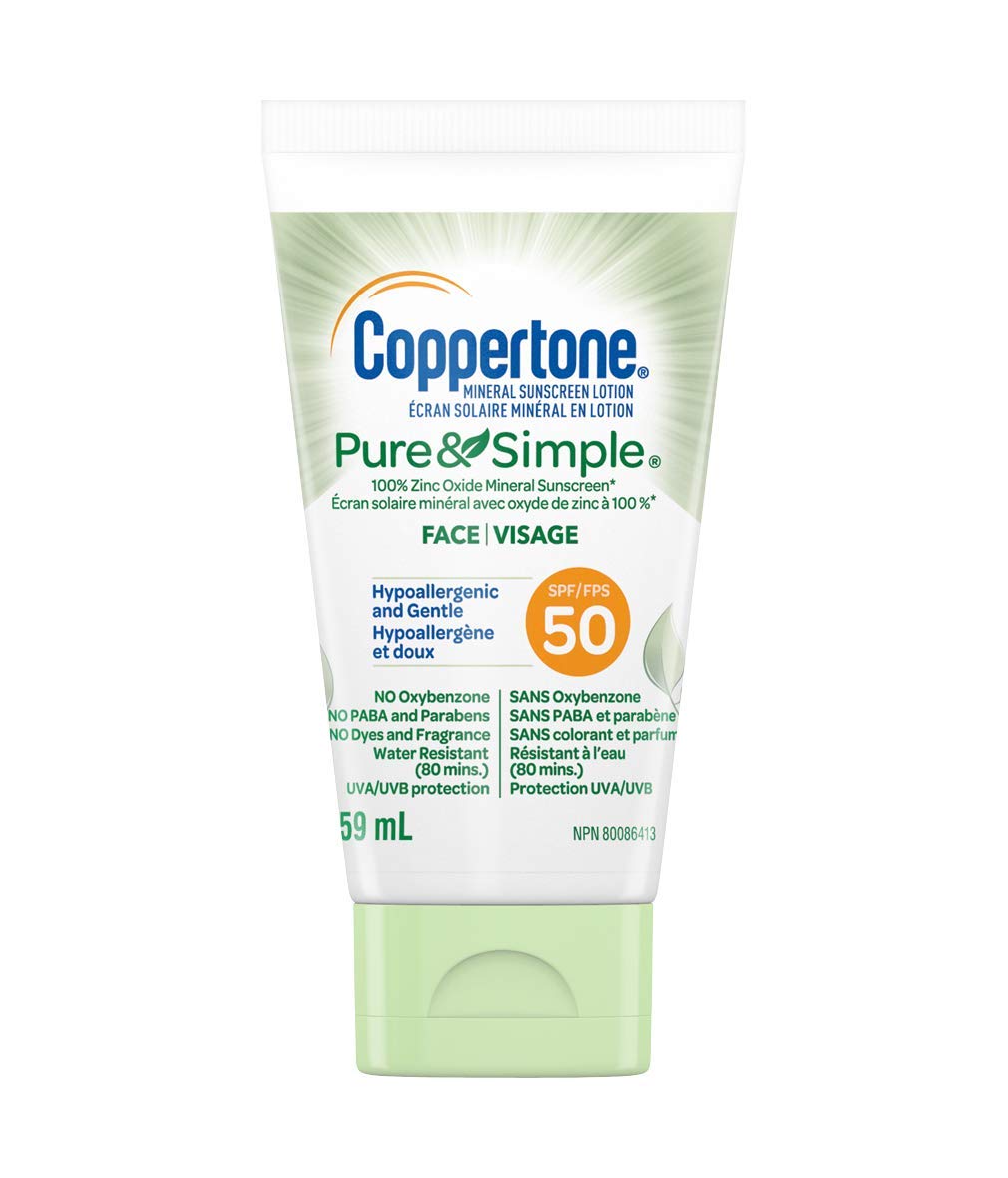Coppertone Mineral Sunscreen lotion pure and Simple Face Spf 50, 100 percent Zinc oxide mineral Face Sunscreen, Hypoallergenic Face Lotion for Sun Protection, 59 ml.