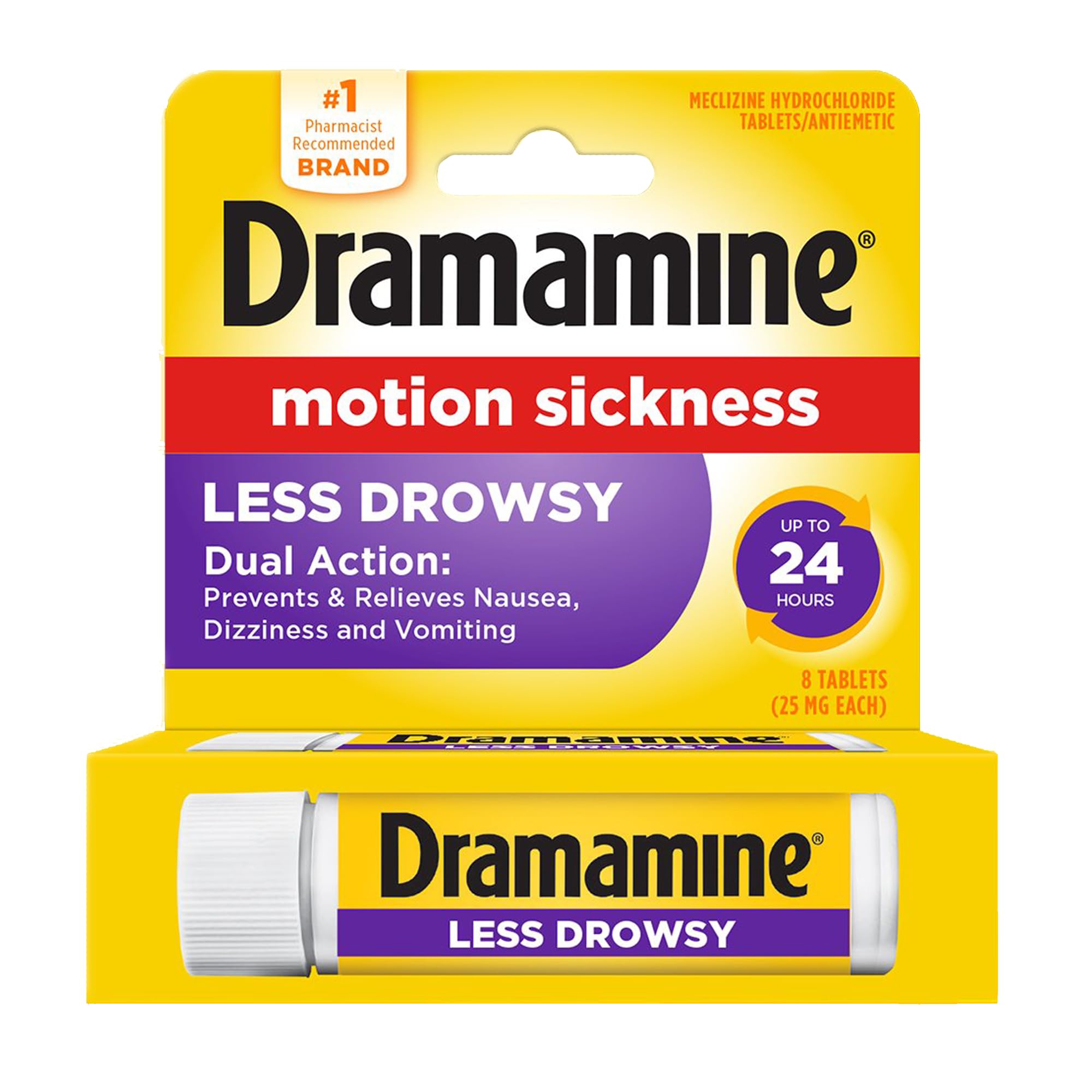 Dramamine All Day Less Drowsy Motion Sickness Relief prevents and treats motion sickness, nausea, vomiting and dizziness for up to 24 hours. The tablets come in a convenient, safety Travel Vial for anytime motion sickness symptoms strike. Get less drowsy relief from motion sickness when you need it most from the number 1 pharmacist-recommended brand!* Wherever your adventure takes you, Dramamine is a vacation essential in your travel medicine bag. Don't let motion sickness affect your plans on your next cruise, theme park, visit or road trip. Dramamine fits with your other travel size toiletries and travel must haves. If you know you are going on an adventure that is likely to cause motion sickness and nausea, take Dramamine Less Drowsy BEFORE the trek. Also, be sure to drink plenty of water and avoid alcohol, which can increase dehydration and nausea. Take Dramamine and Take Control. For adults and children 6 and older. See packaging for dosing instructions and warnings. *Named by Pharmacy Times and U.S. News & World Report as number 1 Pharmacist-Recommended Brand for 2022 Motion Sickness Remedies Category.