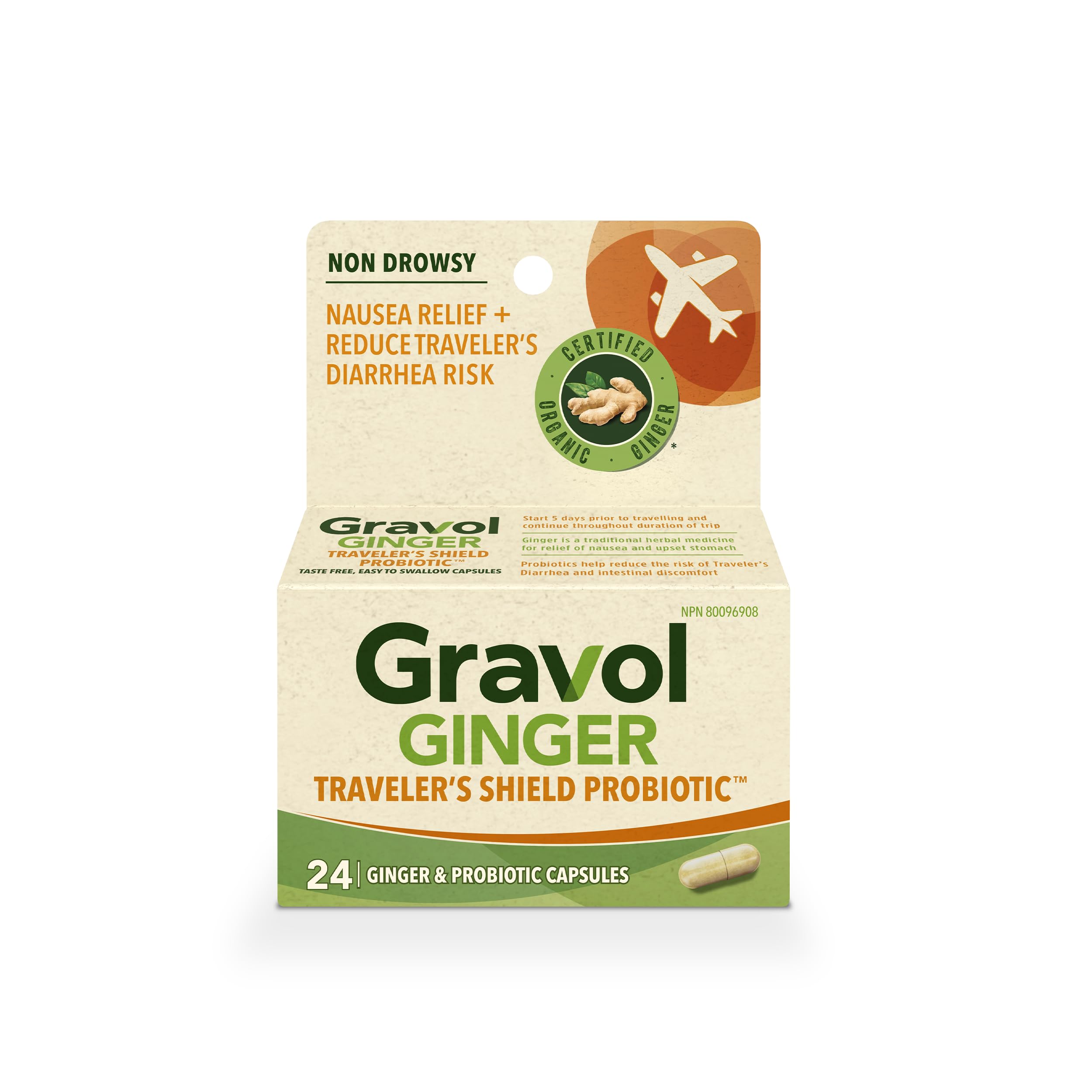 Gravol Ginger Traveler's Shield Probiotic - Nausea and Upset Stomach Relief - Reduces risk of Traveler's Diarrhea - Organic ginger with Probiotic - Non-Drowsy - 24 Capsules (Pack of 1)