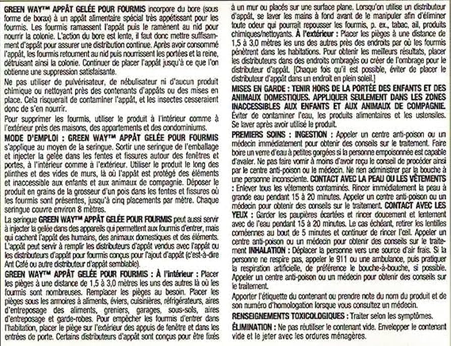 GREENWAY ANT BAIT GEL incorporates boron (in the form of Borax) in special food bait which is highly attractive to ants. Ants pick up the bait and take it to their nests to feed the colony. The boron works slowly and sufficient bait should be made available for continuous feeding. The ants will return to their nests after consuming the bait and will feed their young and the queen, destroying the colony. Repeat placement of the bait until satisfactory control has been achieved. GUARANTEE: Boron 1.35% (present as disodium tetraborate decahydrate)