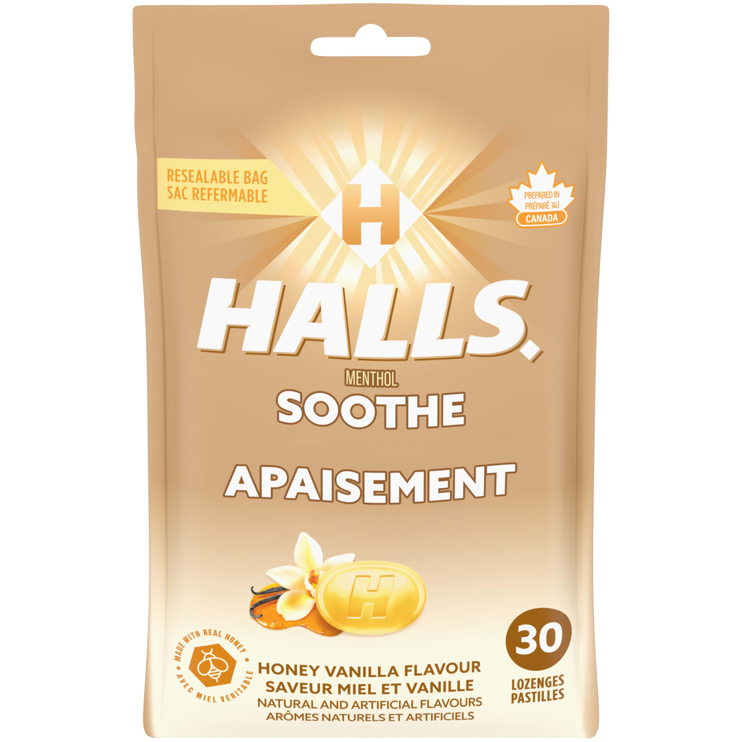 HALLS Honey Vanilla Flavour Cough Drops, Throat Lozenges, Sore Throat Relief, Mentho-Lyptus, 30 Lozenges