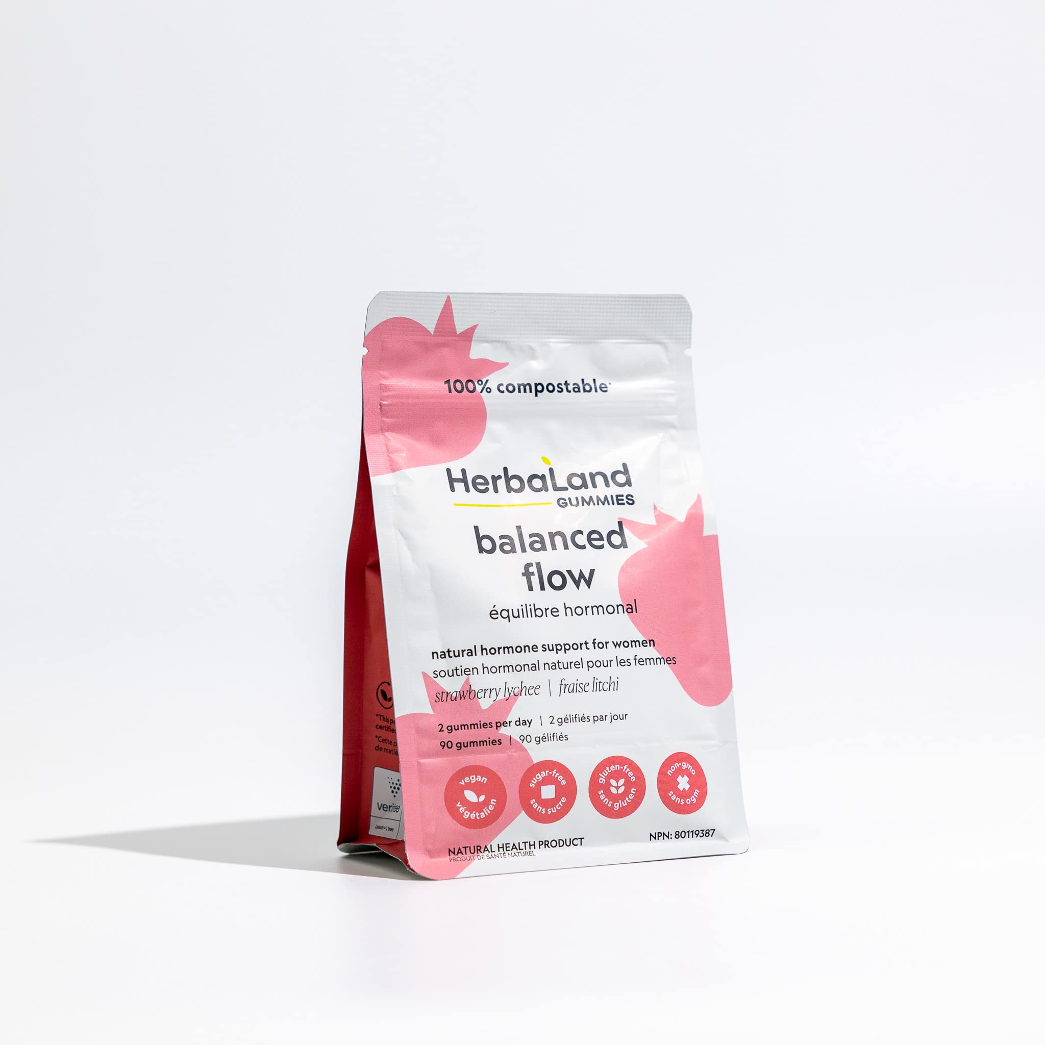 Herbaland Balance Flow Gummies - Contains Chasteberry, Vitamin B6, Calcium, Zinc, Sugar-Free, Gluten-free, Support Women's Hormone, PMS, Menstrual Cycle - Strawberry Lychee Flavor, 90 Count, Compostable Pouch