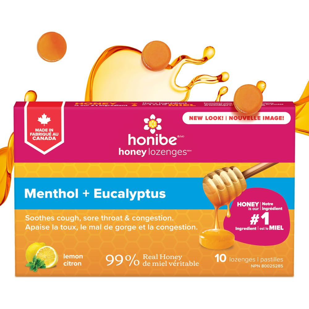 Honibe 100% Pure Honey Lozenges | Made in Canada | Soothes Sore Throat | With Menthol & Eucalyptus | 1 pack (10 lozenges) | Natural Lemon