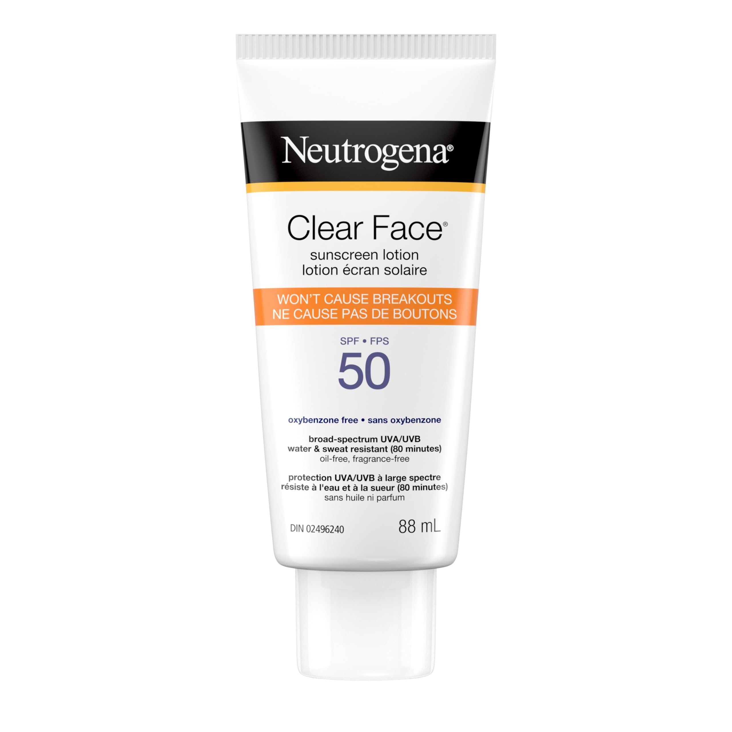 Neutrogena Clear Face Sunscreen Lotion for Acne-Prone Skin, Broad Spectrum SPF 50 UVA/UVB Protection, Oil-, Fragrance- & Oxybenzone-Free Facial Sunscreen, Non-Comedogenic, 88 mL