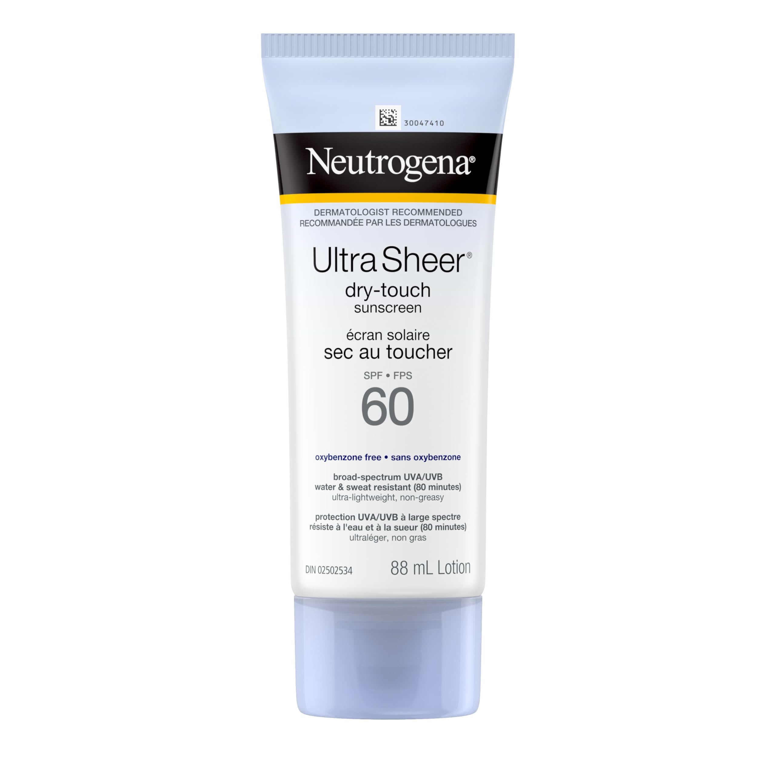 Neutrogena Ultra Sheer Dry-Touch Sunscreen Lotion, Broad Spectrum SPF 60 UVA/UVB Protection, Oxybenzone-Free, Light, Water Resistant, Non-Comedogenic & Non-Greasy, 88 mL