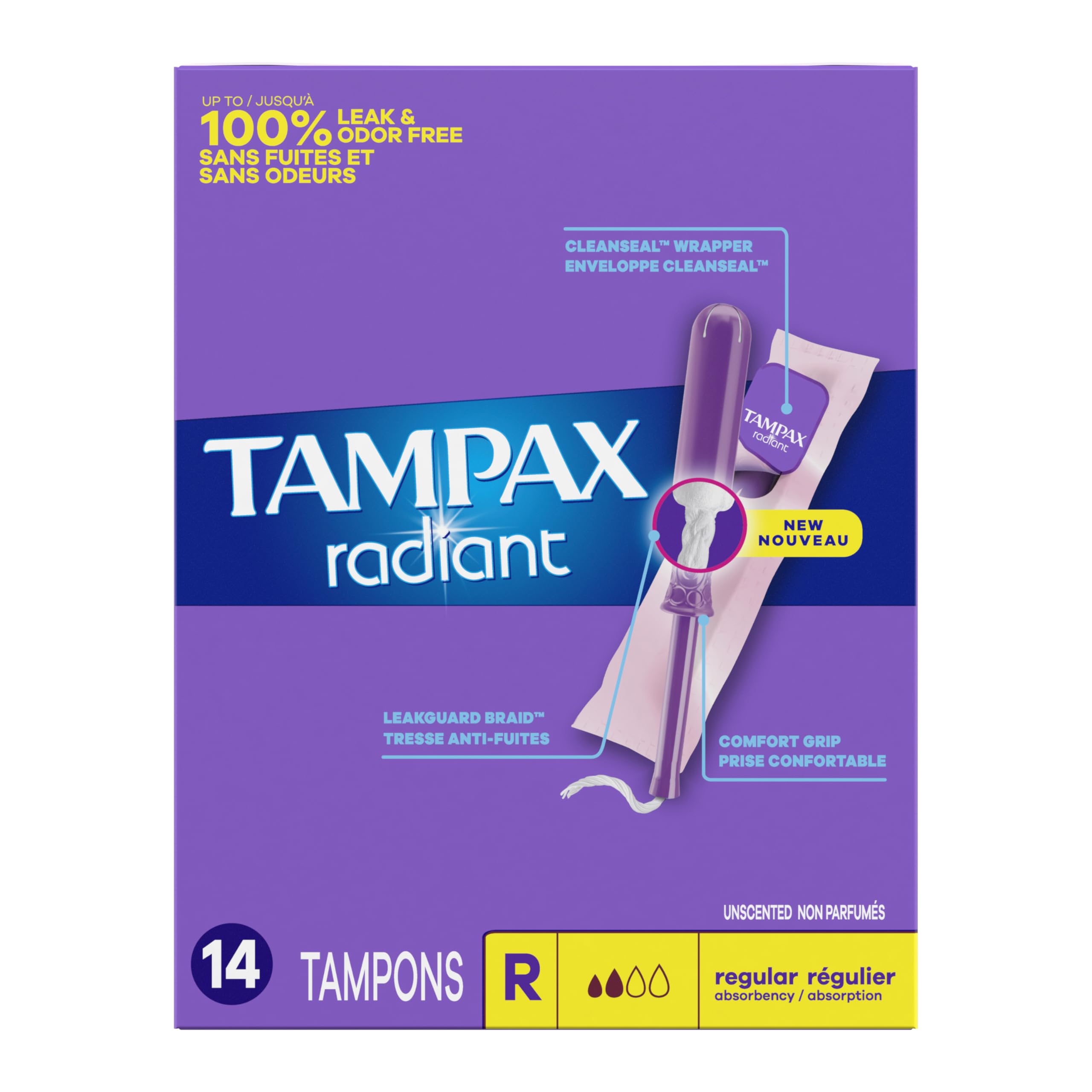 Tampax Radiant Tampons, with LeakGuard Braid, Regular Absorbency, Up to 100% Leak and Odor Free Protection, Unscented, 14 Count