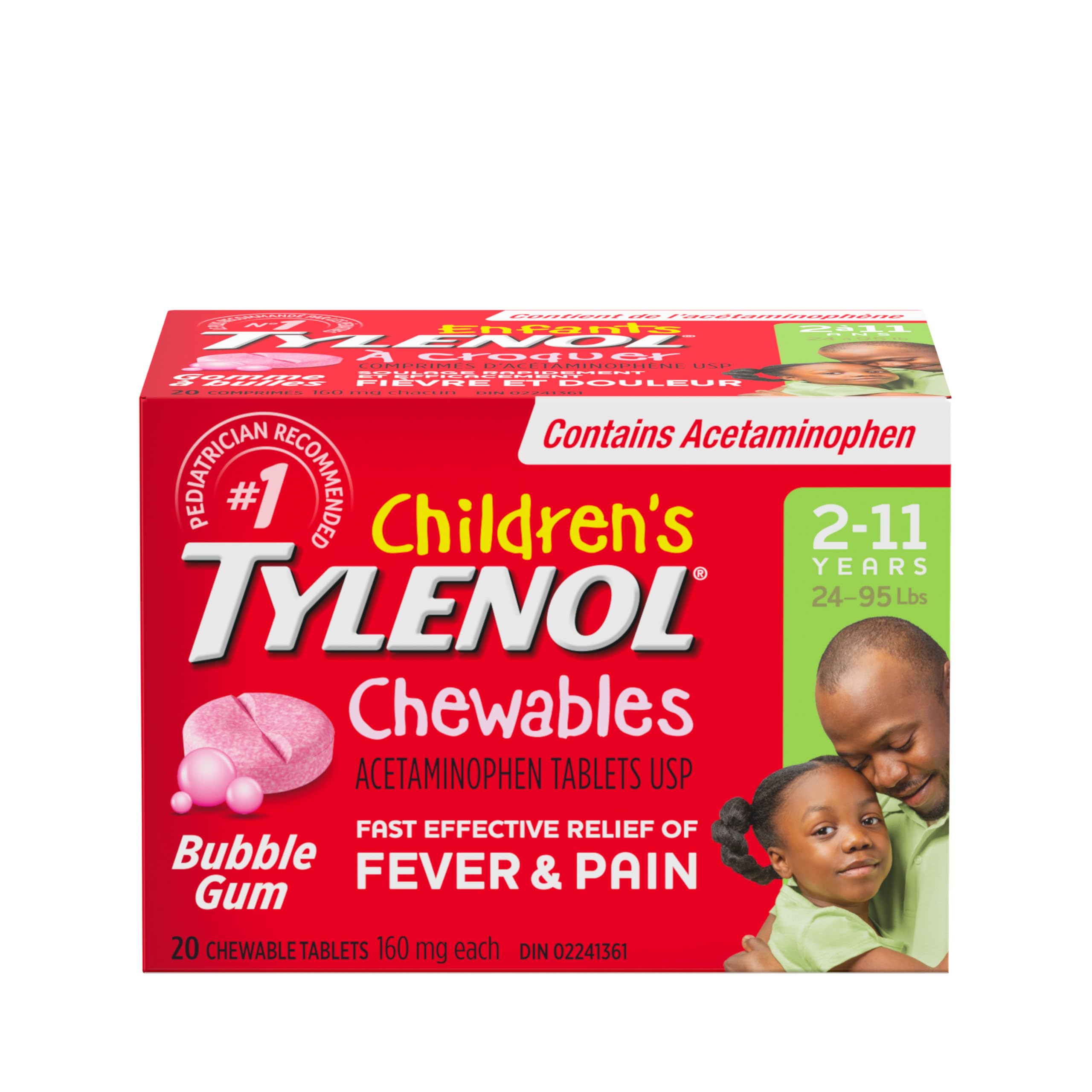 Tylenol Children's Chewables Fever and Pain Relief, Bubble Gum Flavour, 160 mg Acetaminophen, 20 Tablets, Toothache Pain Relief