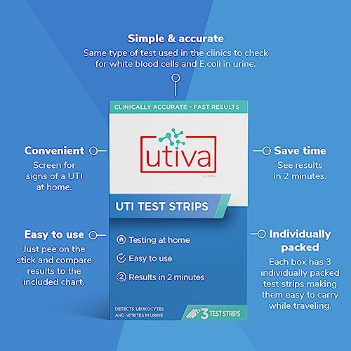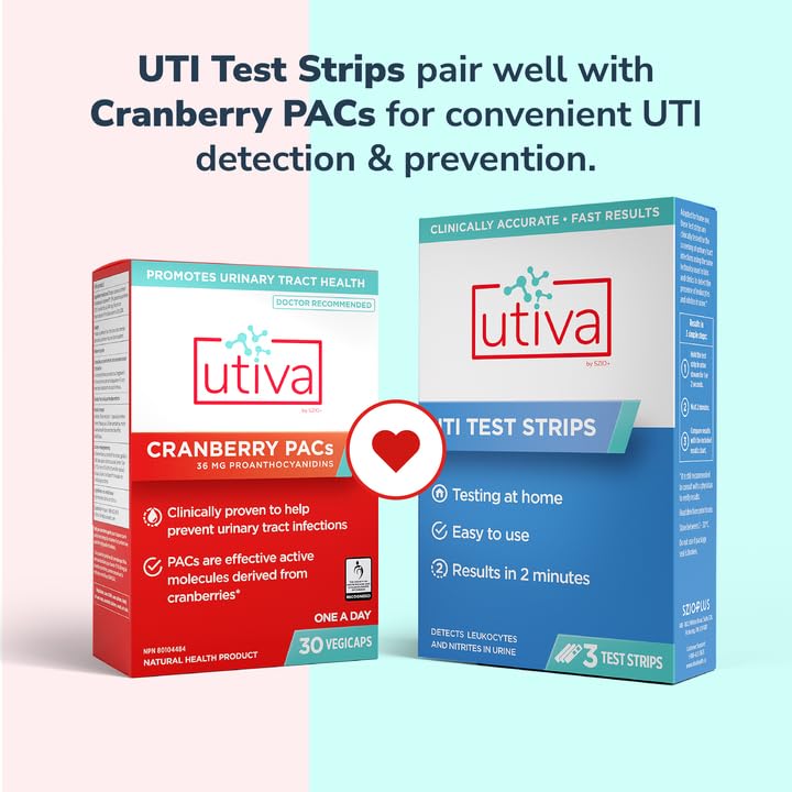 Utiva UTI Test Strips are a convenient way to test for urinary tract infections from the comfort and privacy of your own home. The simple and highly accurate UTI testing kit is designed to detect the presence of Leukocytes (white blood cells) and Nitrites (E.coli) in the urine - that’s the same screening test commonly used by clinics to identify a UTI. This clinically tested home UTI test for men and women is easy to use and offers fast results – just pee on the UTI testing strip, and after 2 minutes compare the color shown on the 2 pads to the color-coded chart that is included to establish a positive, negative or trace result for Leukocytes and Nitrites in the urine. You can then share your at home UTI test results with a medical professional as needed. It’s best to use the first urine of the day, but the UTI urine test can be performed at any time as symptoms present themselves. Utiva UTI testing strips are supplied as 3 individually packaged tests which can be used immediately or safely stored in a cool dry place for future use. The discreet and compact UTI tests are ideal for rapid detection when travelling, and regular use can provide peace of mind to those prone to urinary tract infections. Utiva was built on the belief that everyone deserves the best urinary tract health. Our vision is to provide best-in-class natural supplements and support systems and we’re empowering over 30,000+ people of all ages to proactively manage their urinary tract health every day!