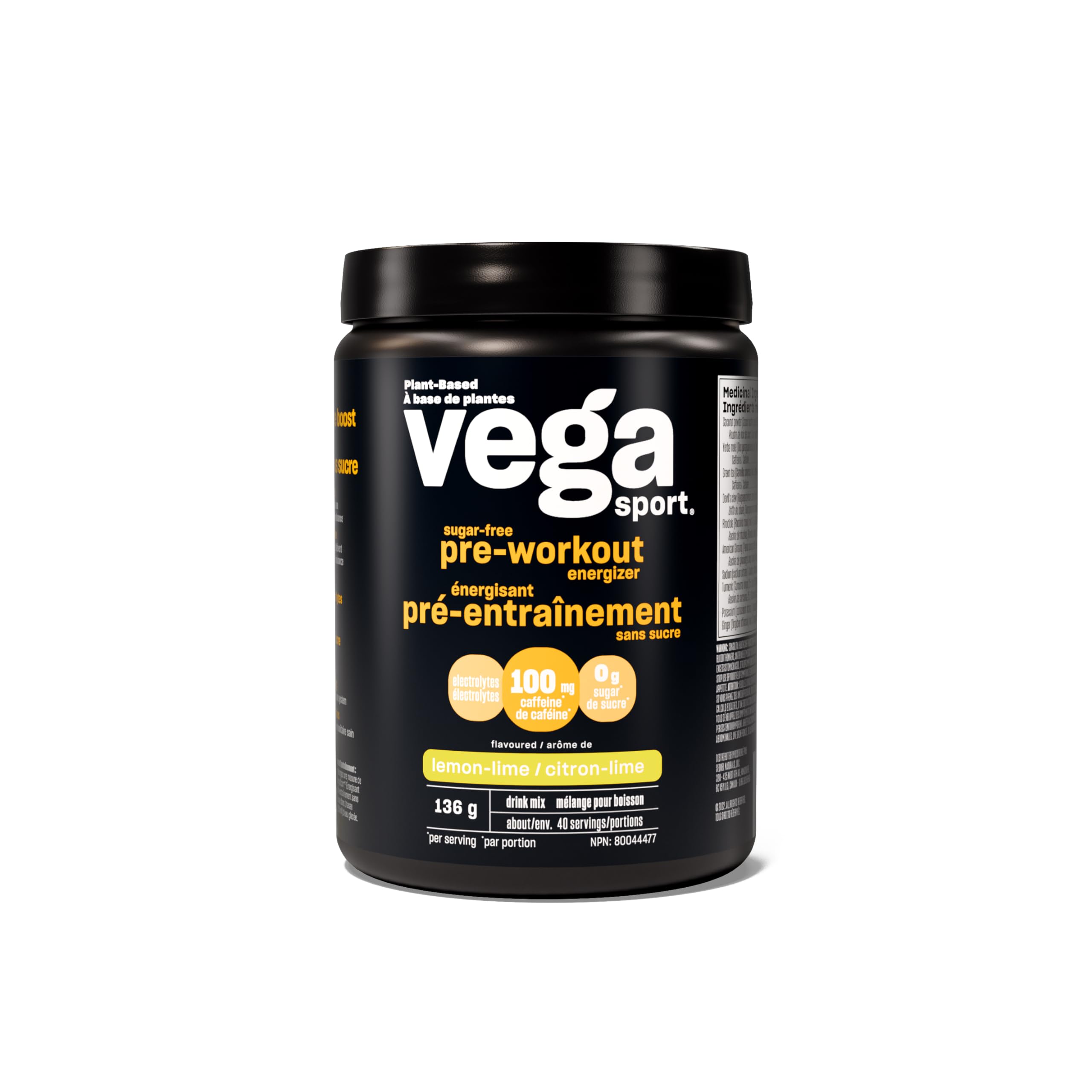 Vega Sport Sugar Free Pre-Workout Energizer, Lemon Lime (40 Servings) Vegan Preworkout Energy Powder, Gluten Free, 100mg Caffeine, Non GMO, 136g (Packaging May Vary)