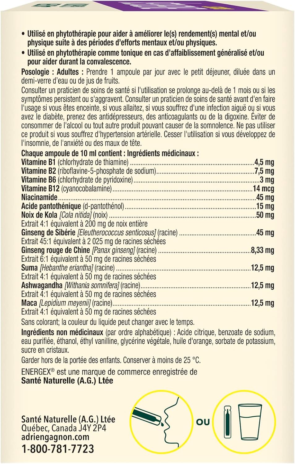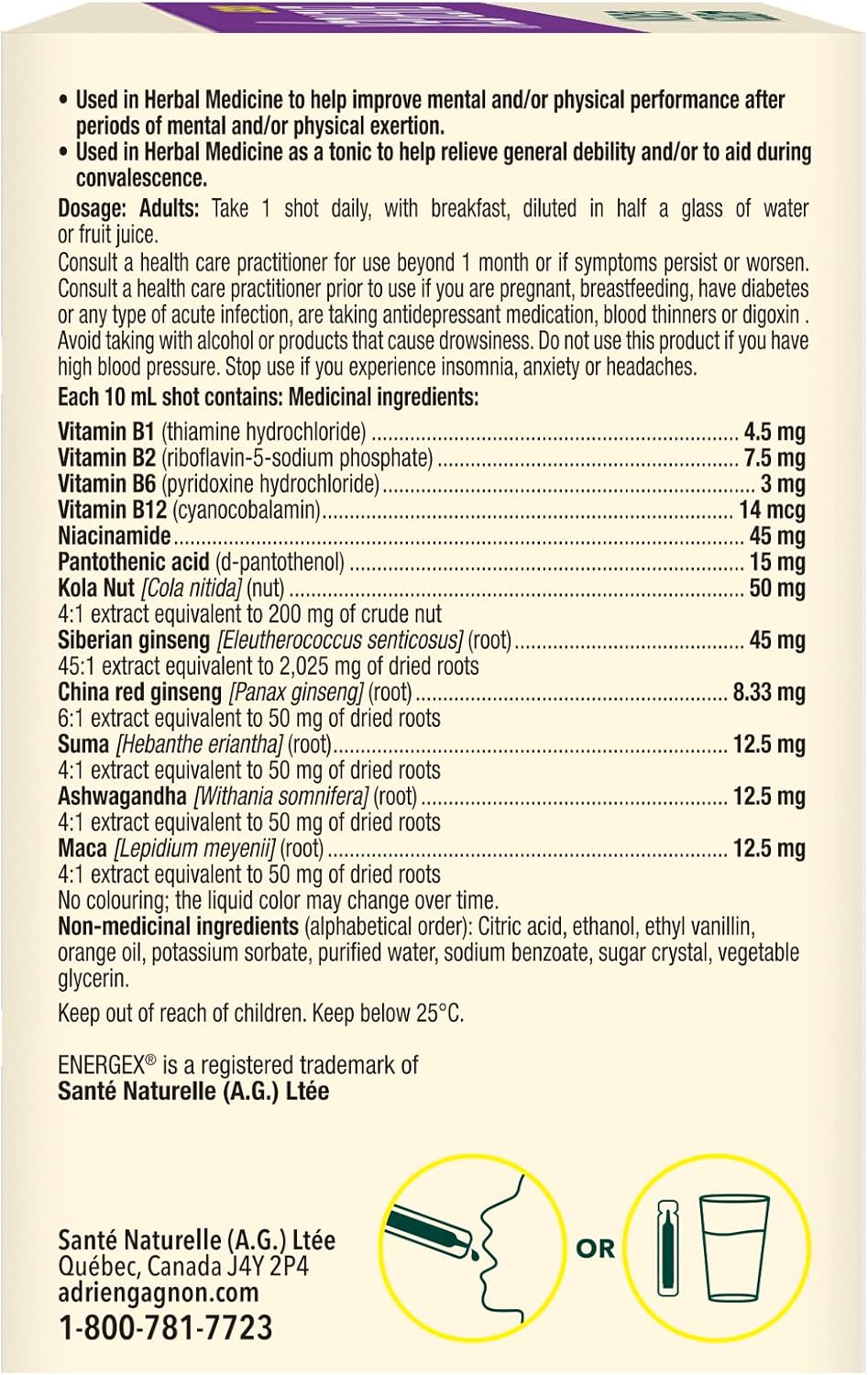 Everyone is looking for ways to increase their energy level and combat temporary fatigue. Energex Boost ampoule is THE formula for intense periods at work and at home. This combination of B vitamins and ginsengs helps you go through your day without missing a thing! The kola nut brings a little touch of caffeine. 1 ampoule, to be directly drink or mixed in water or fruit juice. Ideal for people who are looking for a healthy alternative to energy drinks or coffee! Available in 2 flavors Orange or Caramel