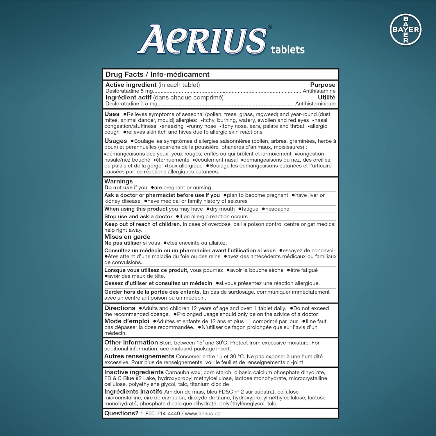 Aerius is clinically proven to provide fast and effective relief of 15 different allergy symptoms. With 5 milligrams of desloratadine per tablet, Aerius is a non-drowsy antihistamine that delivers multi-symptom relief including: itchy, burning, watery, swollen, red eyes, congestion and stuffiness, sneezing, runny nose, itchy nose, allergic cough, itchy throat, itchy ears, itchy palate, skin itch and hives. Whether its plants or animals, indoors or outdoors, Aerius is backed by science to relieve your allergy symptoms. Plus, this long-lasting formula lets you do The things you like, all year round, without your allergy symptoms getting in the way. Aerius is available in 10 tablets, 20 tablets, 30 tablets, 50 tablets, and an 80 tablet value pack. Aerius is pharmacist and doctor recommended. To be sure this product is right for you, always read and follow the label.