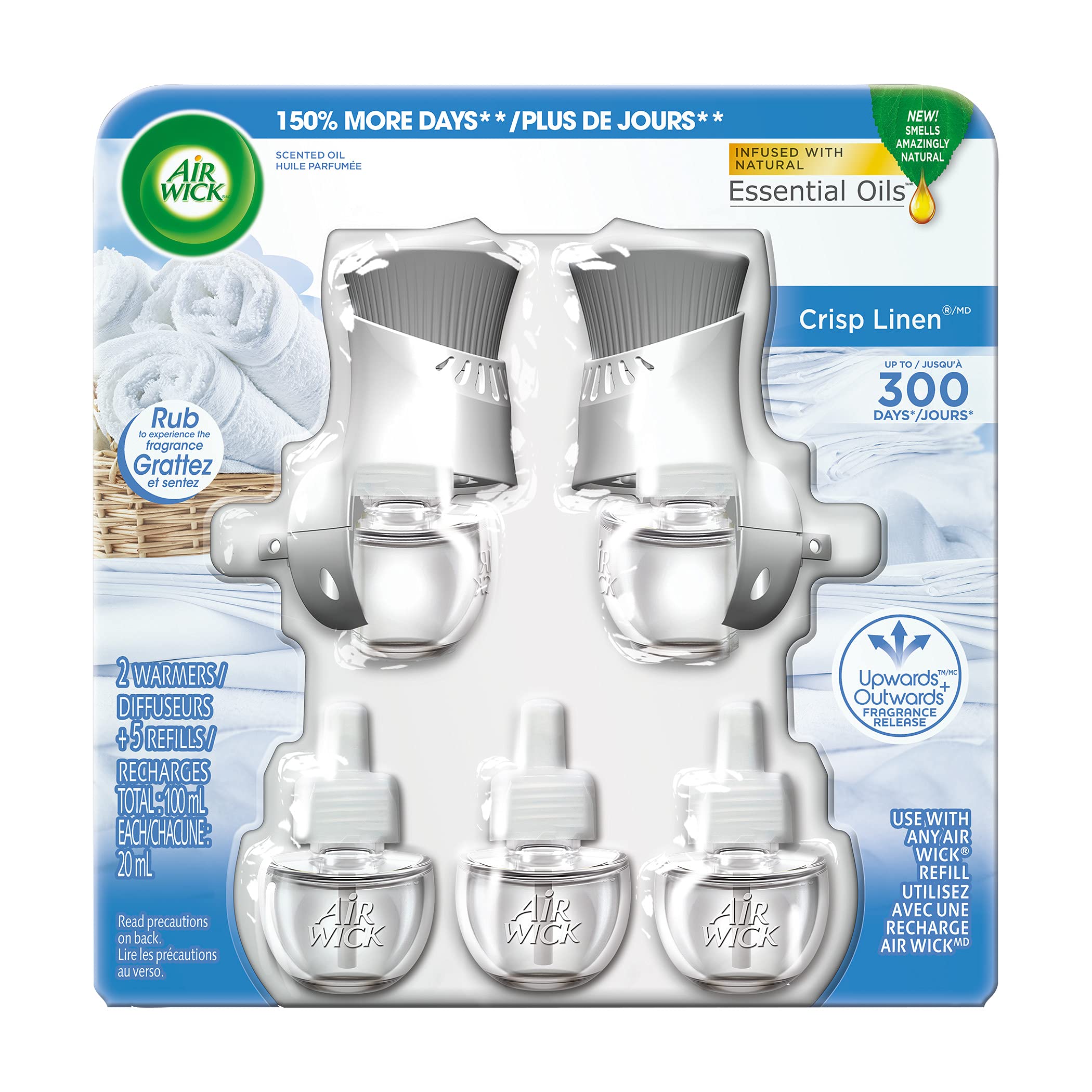 Airwick Scented Oil Crisp Linen, Infused with natural Essential Oils, 2 Warmers/Diffuseurs+5 Refills/Recharges Total 100ml.