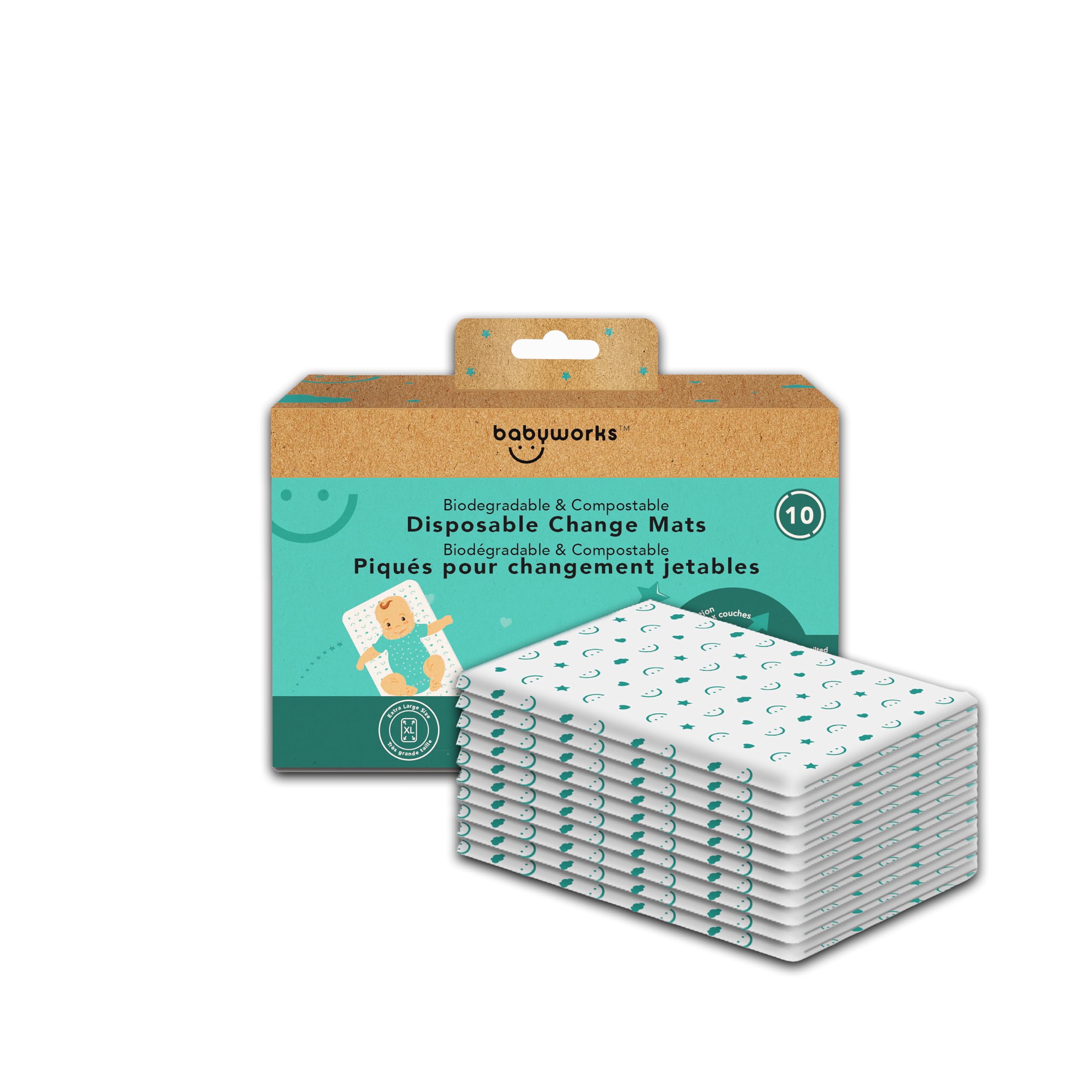 Baby Works - Disposable, Biodegradable, & Compostable Change Mats. Waterproof & Leak-Proof Changing Pad, Super Soft, for Babies & Toddlers - 68x45 cm, 10 Count
