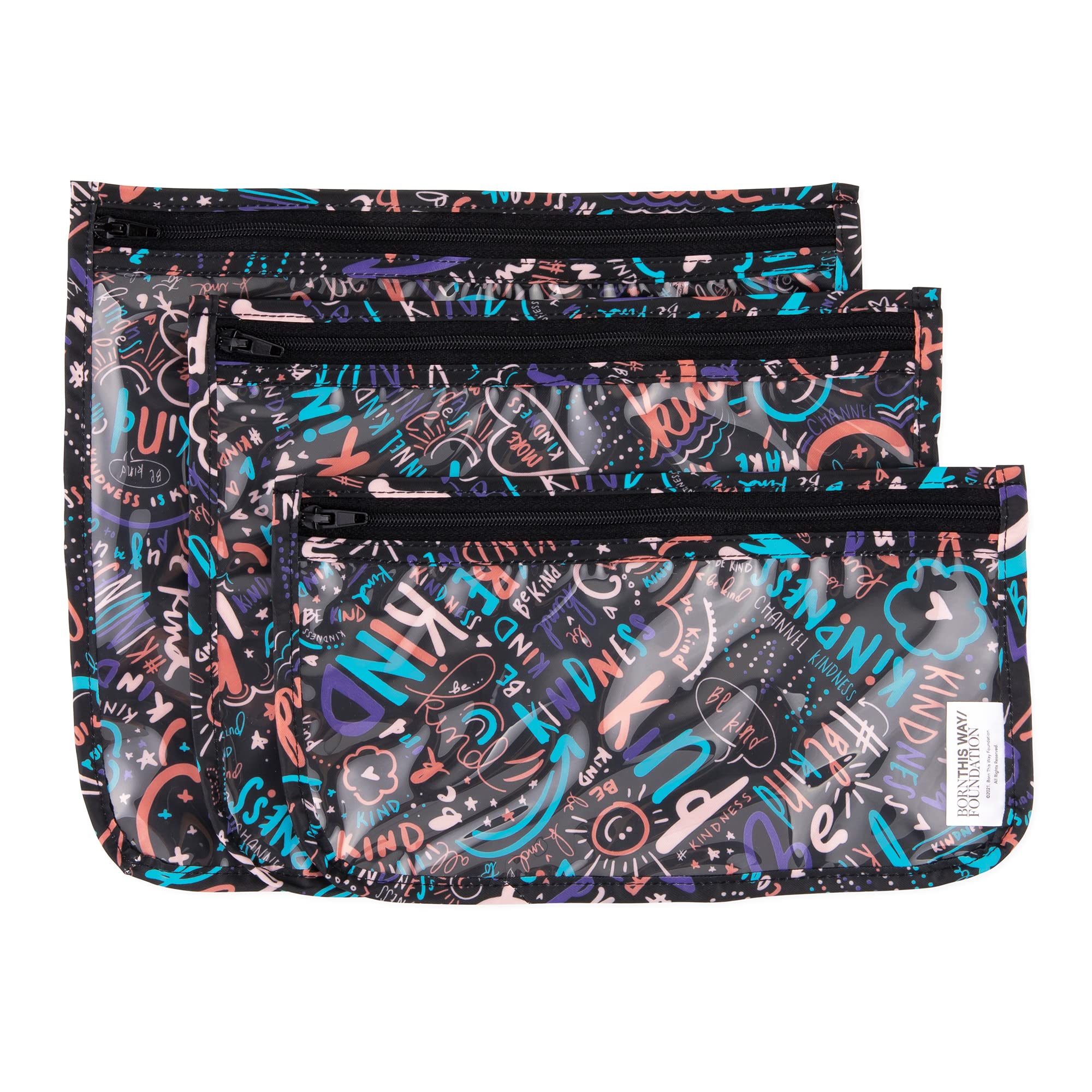 Bumkins Travel Bag, Toiletry, TSA Approved Pouch, Zip Bag, Quart Size Airline Compliant, Clear-Sided, Baby, Diaper Bag Organization, Accessories, Packing, Set of 3 Sizes, Born This Way Kindness