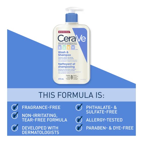 CeraVe Baby Wash & Shampoo Gentle Tear-Free Formula Hypoallergenic, Fragrance Free, Paraben Free & Sulfate Free,473 ml, White