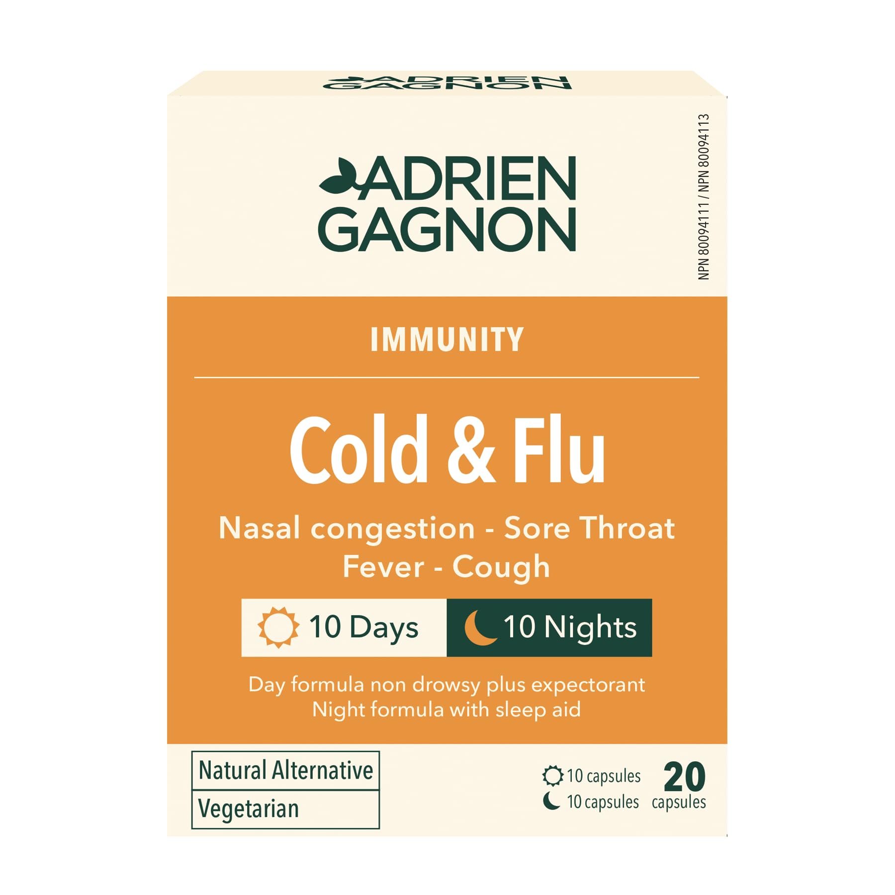 Adrien Gagnon - Cold and Flu - Night and Day Formula - For Relief of nasal congestion, sore throat, fever, and cough - 20 Capsules.