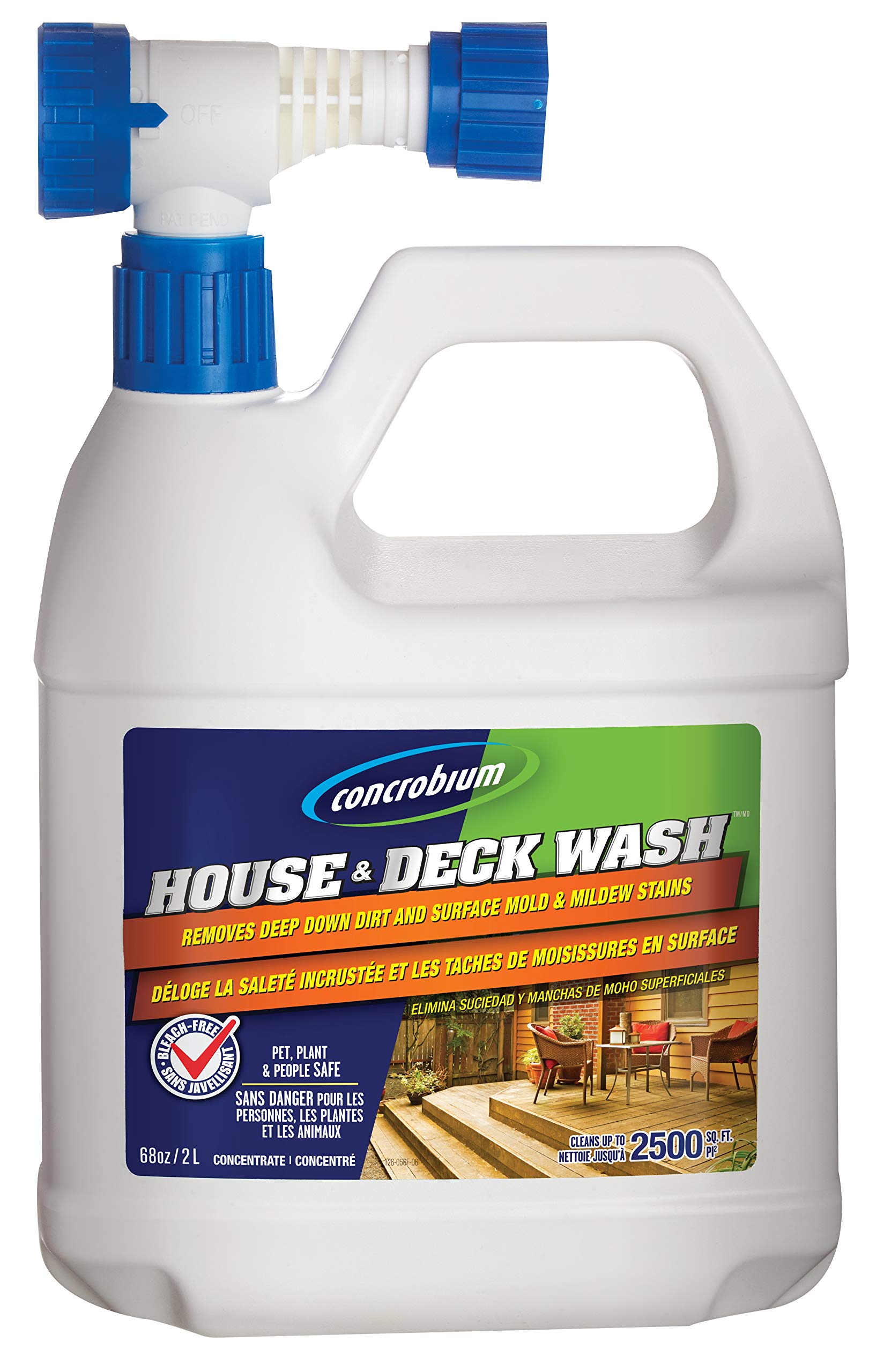 Concrobium House & Deck Wash Multi-Purpose Cleaner removes dirt, grime and mold and mildew stains from siding, decks, patios and other exterior surfaces. Non toxic cleaner comes in an easy-to-use hose mount spray bottle for fast setup and application. solution is bleach free with no harmful chemicals for safe use around plant life and grass. Apply on wood, composite wood, stone, masonry, concrete, stucco, vinyl, aluminum, fabric and more.