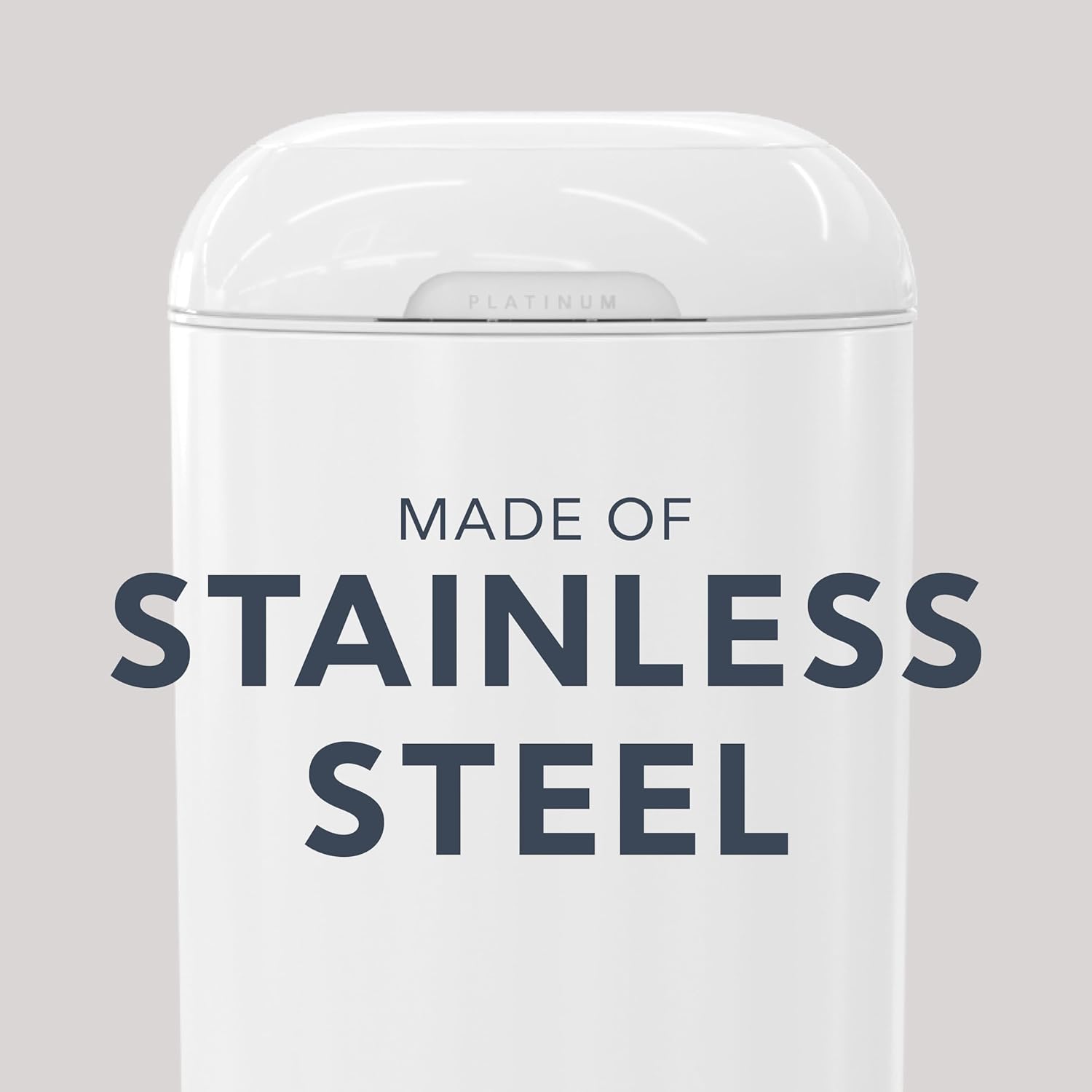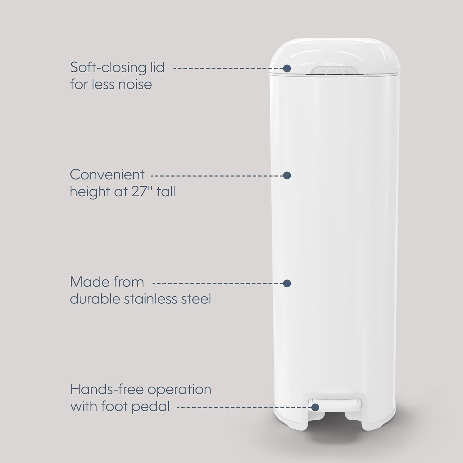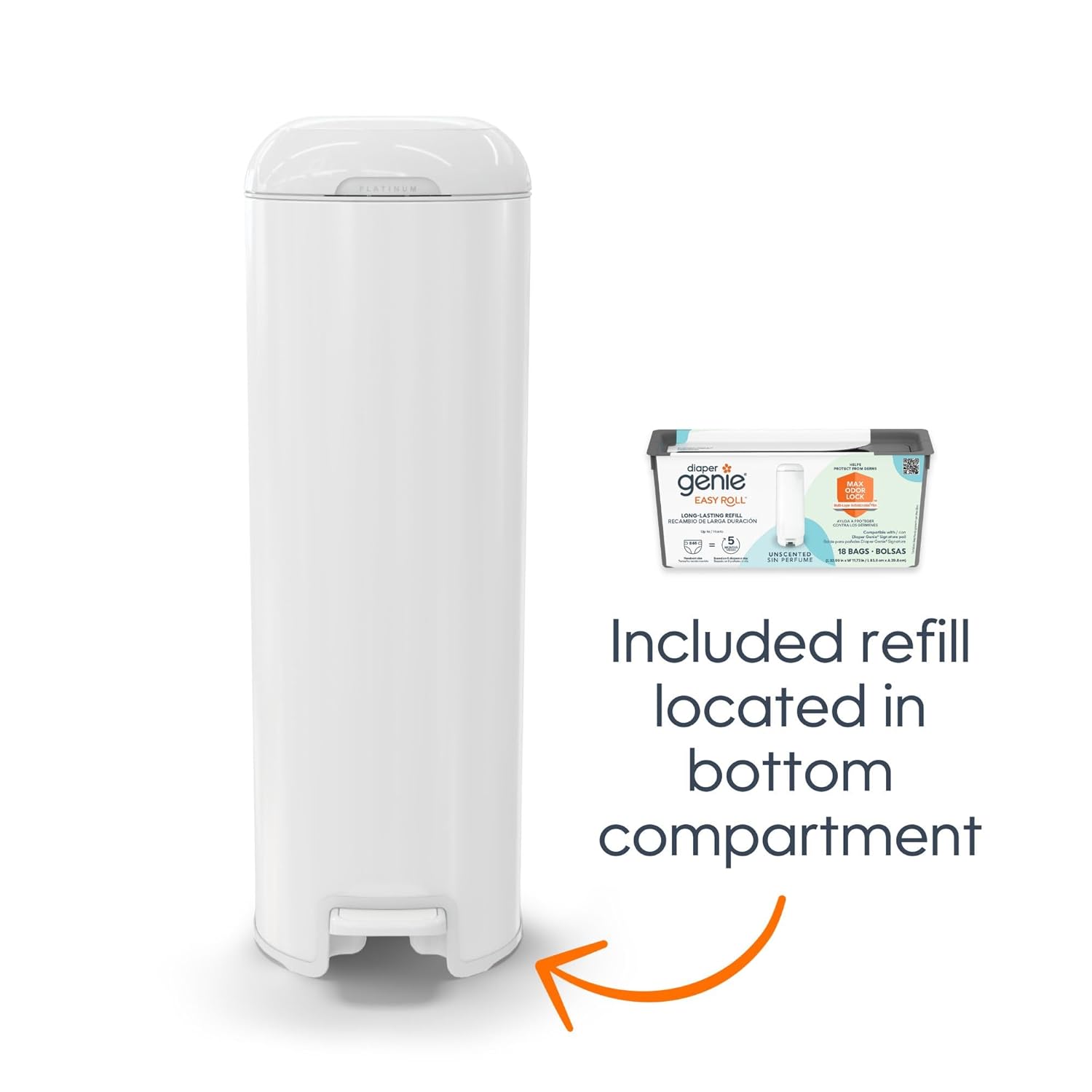 Keep your nursery fresh with our new metal pail! The new Diaper Genie Platinum pail is made of durable stainless steel and has odor-locking clamps that help prevent odors of messy diapers from escaping. With its 27" height, wide opening and foot pedal, the Diaper Genie Platinum offers true hands-free operation. Our diaper disposal system holds up to 47 newborn diapers and includes a long-lasting refill that can last up to 5 months or hold up 846 newborn diapers. The Easy Roll β’ refill bags are made from durable multi-layer antimicrobial film with odor-locking barrier technology. Refill includes 18 easy tear-off bags that are perforated for convenient use and disposal. The pail is available in lilly white or stone grey.