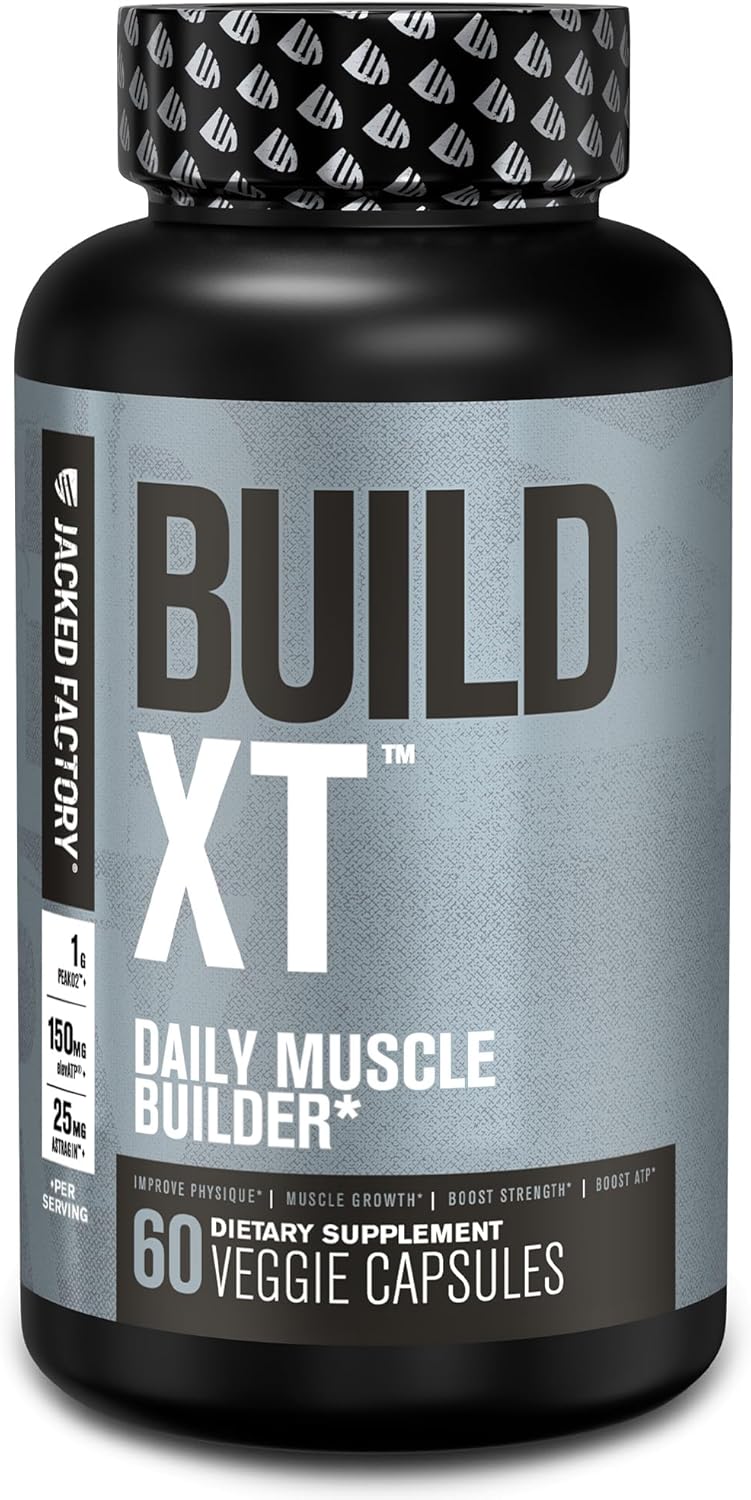 Boost your muscular strength and growth with Jacked Factory Build-XT. This daily muscle builder and performance enhancer uses trademarked ingredients Peak02, ElevATP, and Astragin to deliver effective results. Take your workouts to the next level and see the benefits with 60 veggie pills.