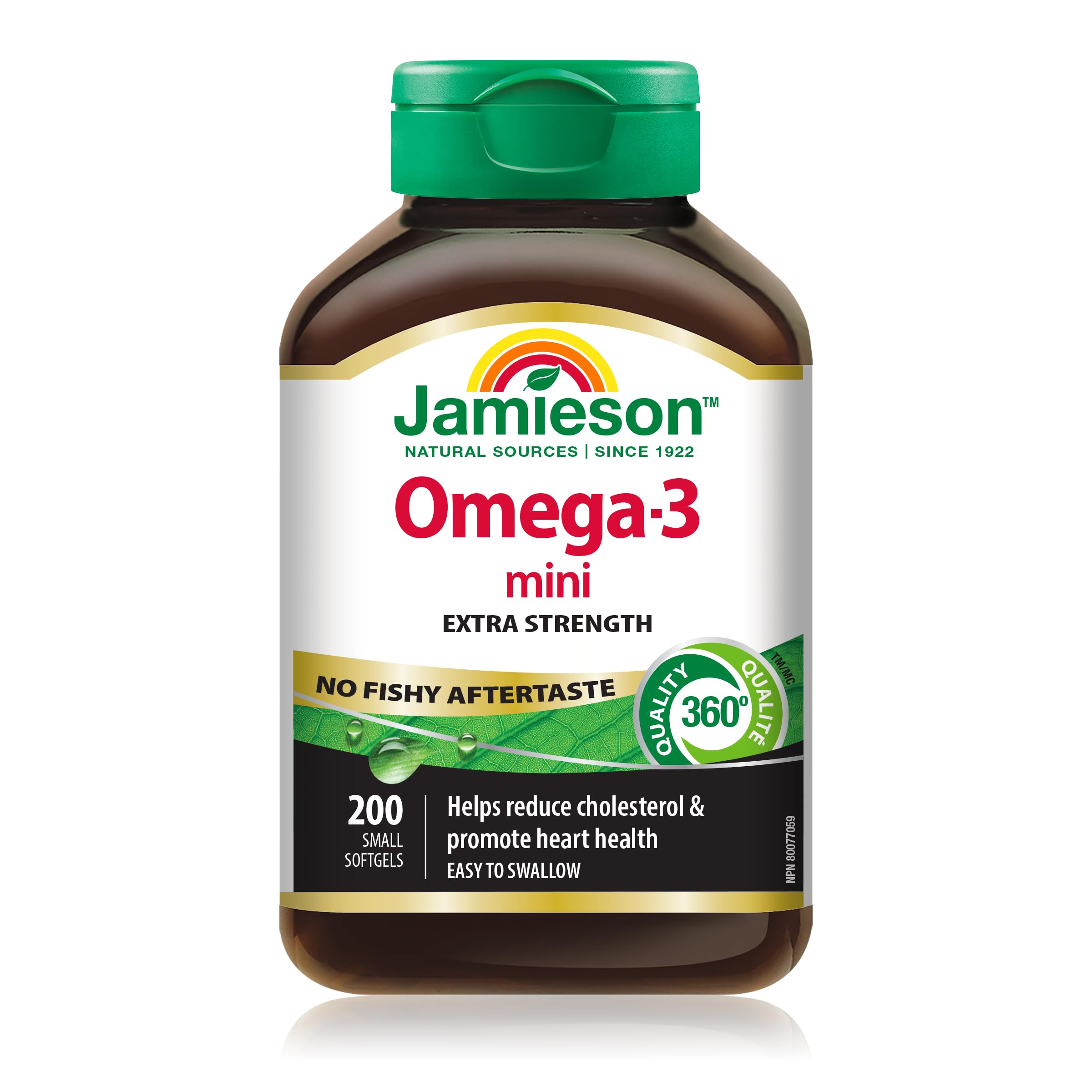 Jamieson Omega-3 Mini Softgels, No Fishy Aftertaste, Improves Heart Health, and Supports Brain Health. With 210 mg EPA and 140 mg DHA, No Burpback, Easy to Swallow, Gluten-Free, Non-GMO, 200 Count