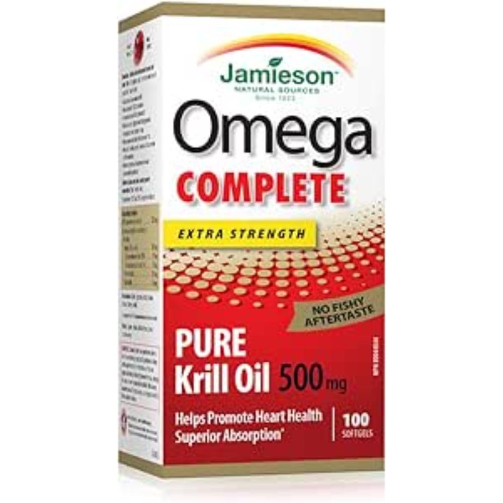 Jamieson Omega Complete Pure Krill Oil 500 mg Softgels, No Fishy Aftertaste, Supports Heart Health, and Provides Superior Absorption. With Antarctic Krill Oil, EPA, DHA, Phospholipids, and Astaxanthin, Gluten-Free, 100 Count, Proudly Canadian