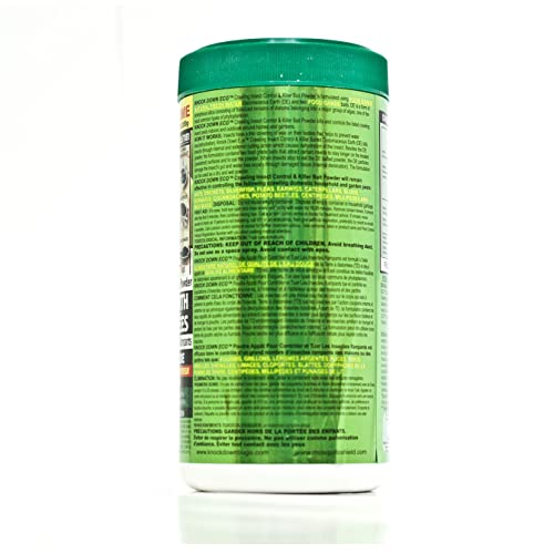 Ingredients/Guarantee: Silicon Dioxide (present as 100% diatomaceous earth) 79.5% Outdoor Application (dry powder) for ants, caterpillars, centipedes, millipesdes, crickets, potato beetles, slugs, sowbugs. Lightly coat areas where these pests are found or may hide including patios, windows, door frames and sills,outside of entrance ways, around foundations, and along ant trails. Hit insects directly where possible. For best results, use in areas where dust application cannot be affected by heavy rains or high winds. Outdoors Application (powder with water) for ants, caterpillars, crickets, potato beetles, slugs and sowbugs. For longer control outdoors, use as a wettable powder with water around foundations, shrubs, flowerbeds, gardens etc. Hit insects directly where possible . Repeat treatment as necessary. Indoors (dry powder only). For bed bugs, disassemble beds and dust frames, joints, mattresses,. tufts and seams, floors and baseboards. Indoors (dry powder only). For fleas. Thoroughly dust sleeping quarters of pets and surroudning cracks, crevices, carpeting and baseboards. Indoors (dry powder only). For ants, earwigs, silverfish, sowbugs, cockroahces, centipedes, millipedes. Gently squeeze or shake the container to lightly coat the areas where insects crawl and hide such as cracks or crevices behind and beneath refrigerators, stoves, sinks, cabinets, garbage cans, around pipes and drains, window frames and ibn attics and basements. Hit insects directly where possible . Repeat treatment as necessary. Dosage: Dry Dust (Indoor and Outdoor). Lightly coat desired area. Apply 50g of KNOCK DOWN ECO Crawling Insect Control & Killer Bait Powder per 10m2 (1oz per 65 ssq ft). Dosage: Wettable Powder. Apply to point of wetness 75g in 1L of water per 10m2 (2.5 oz per 1qt water per 65 sq ft. Disposal: Do not reuse empty container. Keep out of reach of children. Read the label before using. Reg. No 31048 P.C.P. Act