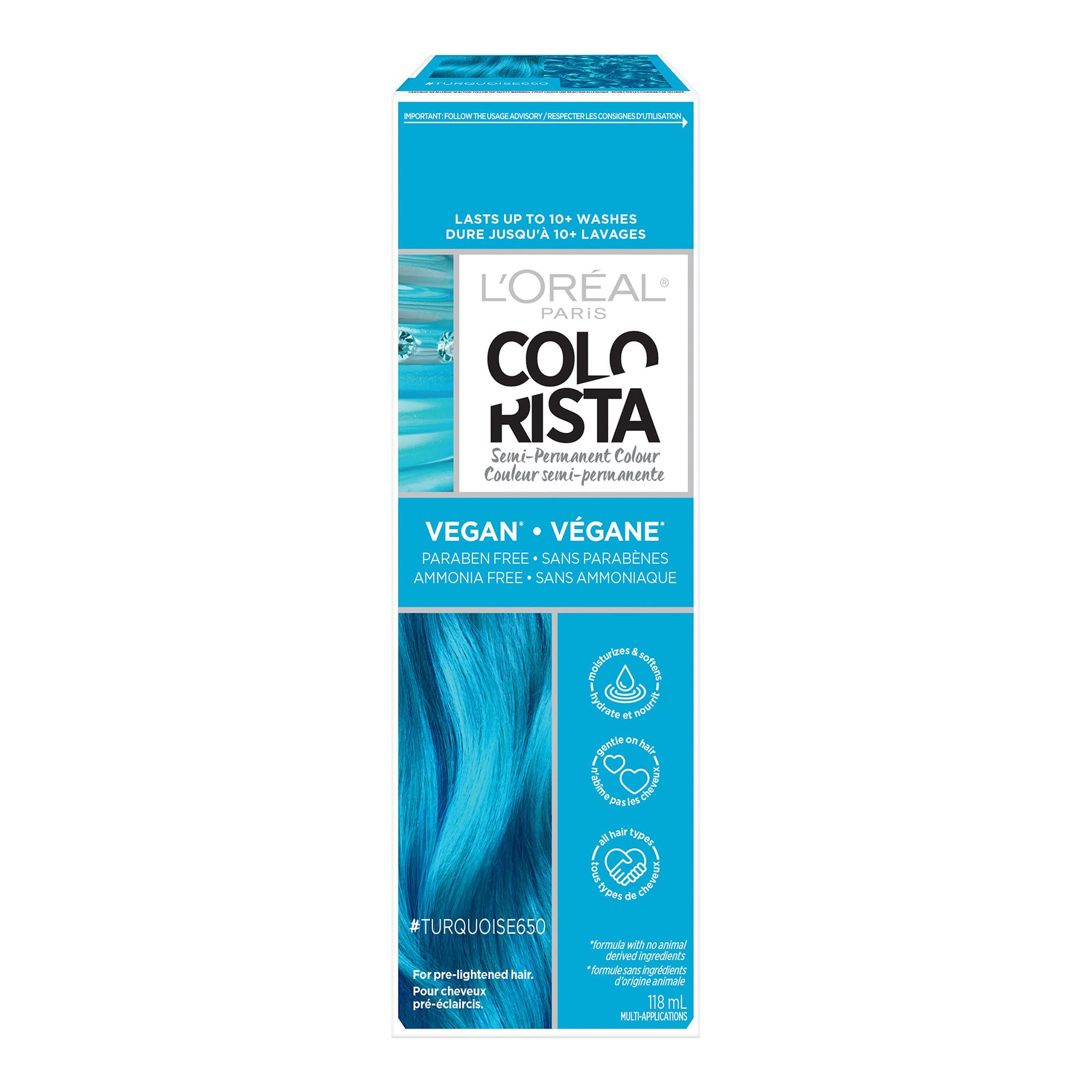 L’Oréal Paris Colorista Semi Permanent Hair Color for Bleached or Blonde Hair, 650 Turquoise, Color Depositing Hair Mask Formula, 1 EA (Packaging May Vary)
