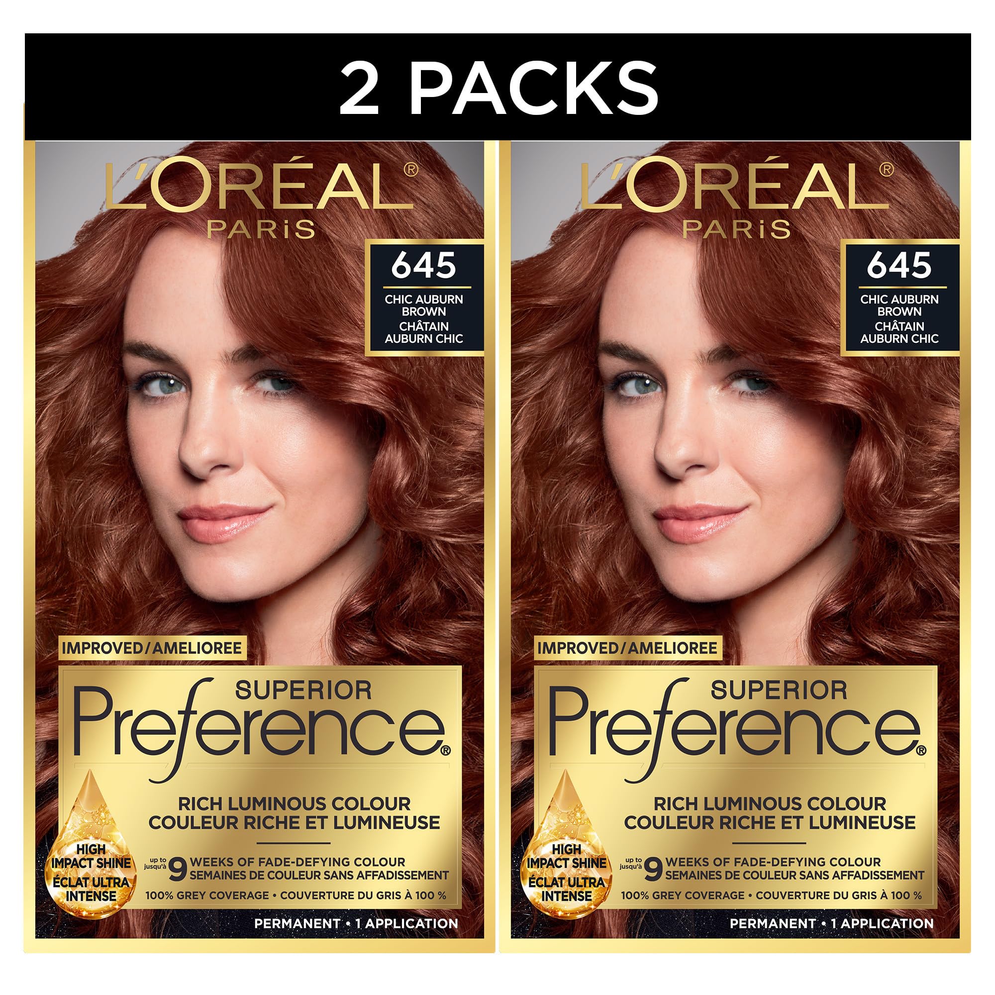 L'Oreal Paris Superior Preference Hair Dye, Hair Color for Women, 645 Chic Auburn Brown Hair Dye, Permanent Hair Color, 100% Grey Coverage, 9 weeks of Luminous Fade-Defying, 1 Hair Dye Kit (Pack of 2) (Packaging May Vary)