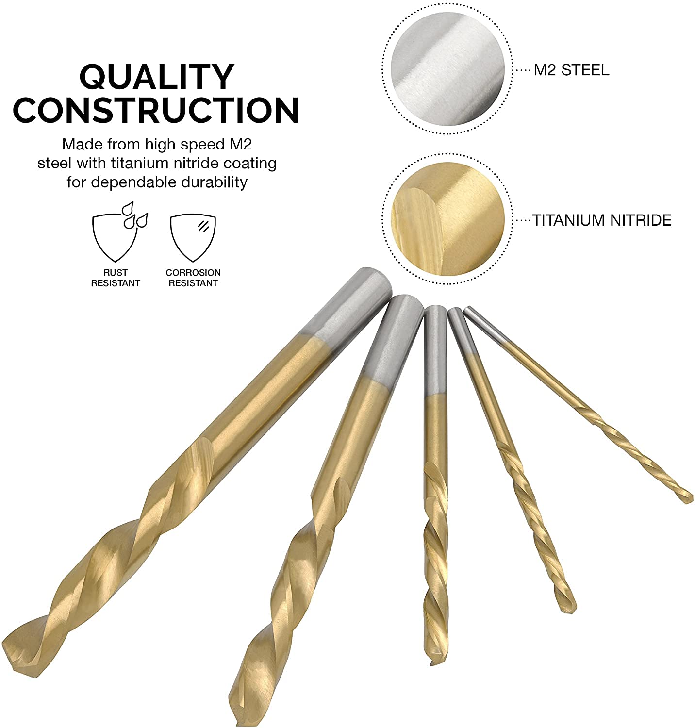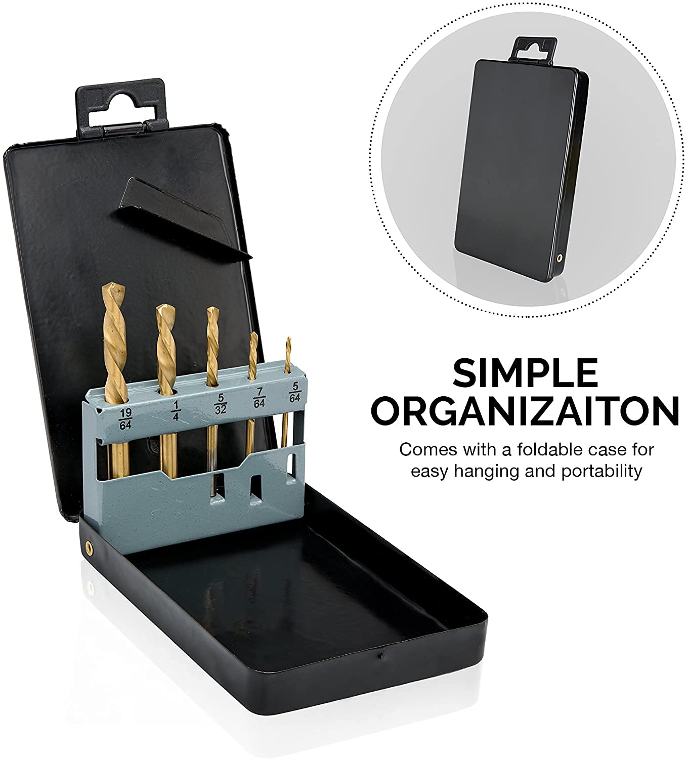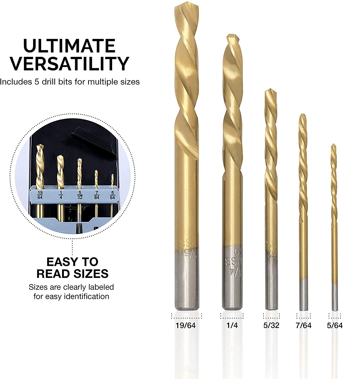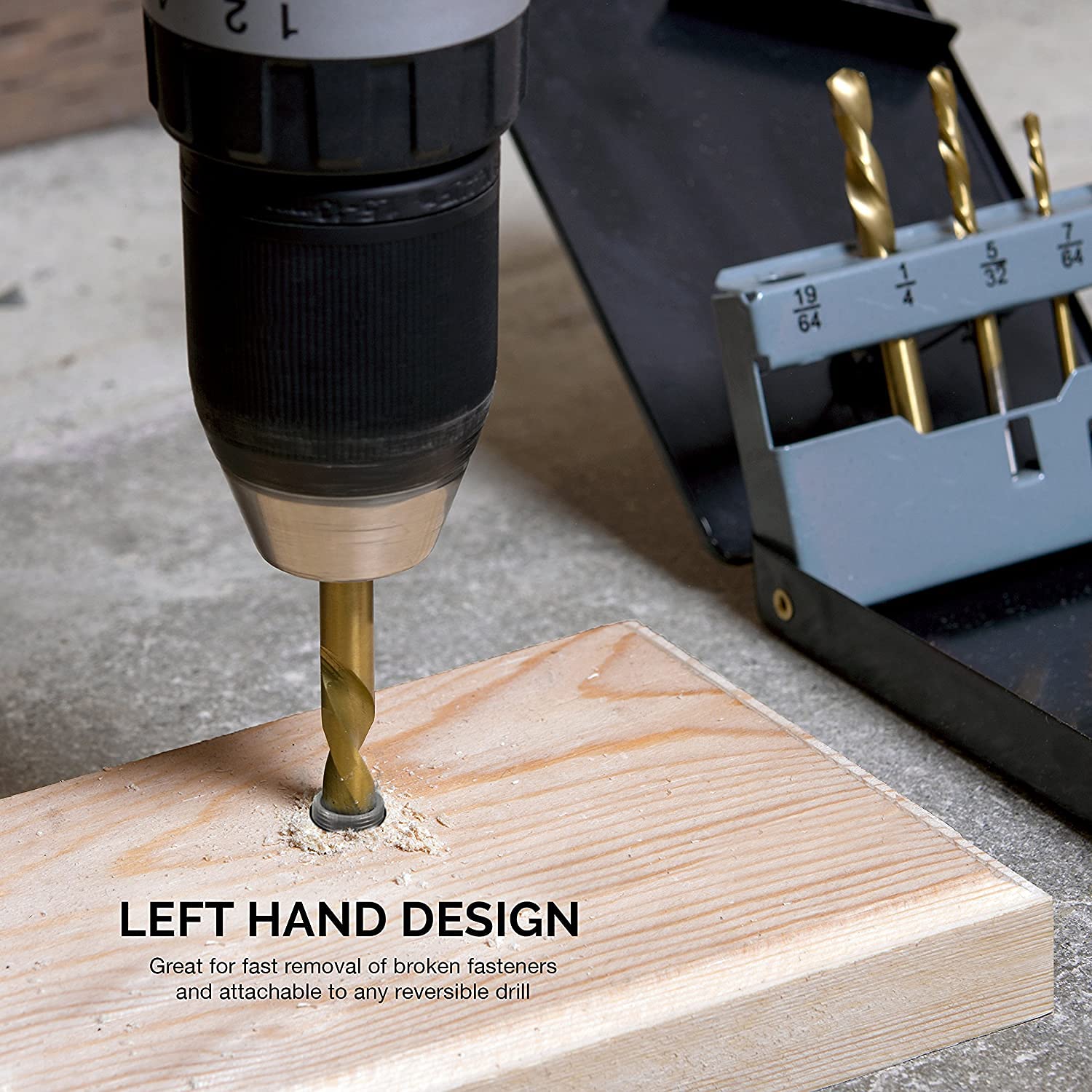 NEIKO 10113A Left-Hand Drill-Bit Set, High-Speed Steel Drills with Titanium Nitride Coating, Reverse-Twist Drill Bits, SAE Sizes, 5-Piece Set