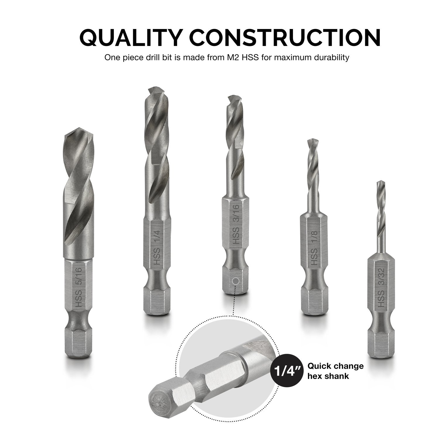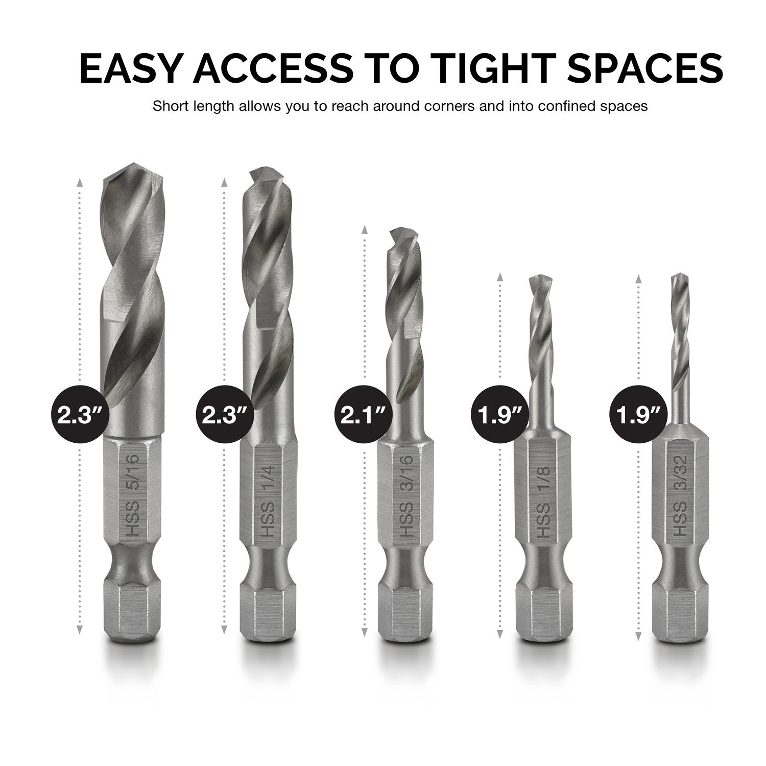 NEIKO 11402A Stubby Drill Bit Set for Metal, 5 Piece 1/4" Quick Change Hex Shank, M2 High Speed Steel for Quick Change, Chucks and Drives Drill Bit Holder Included, Hex Shank Drill Bit Set