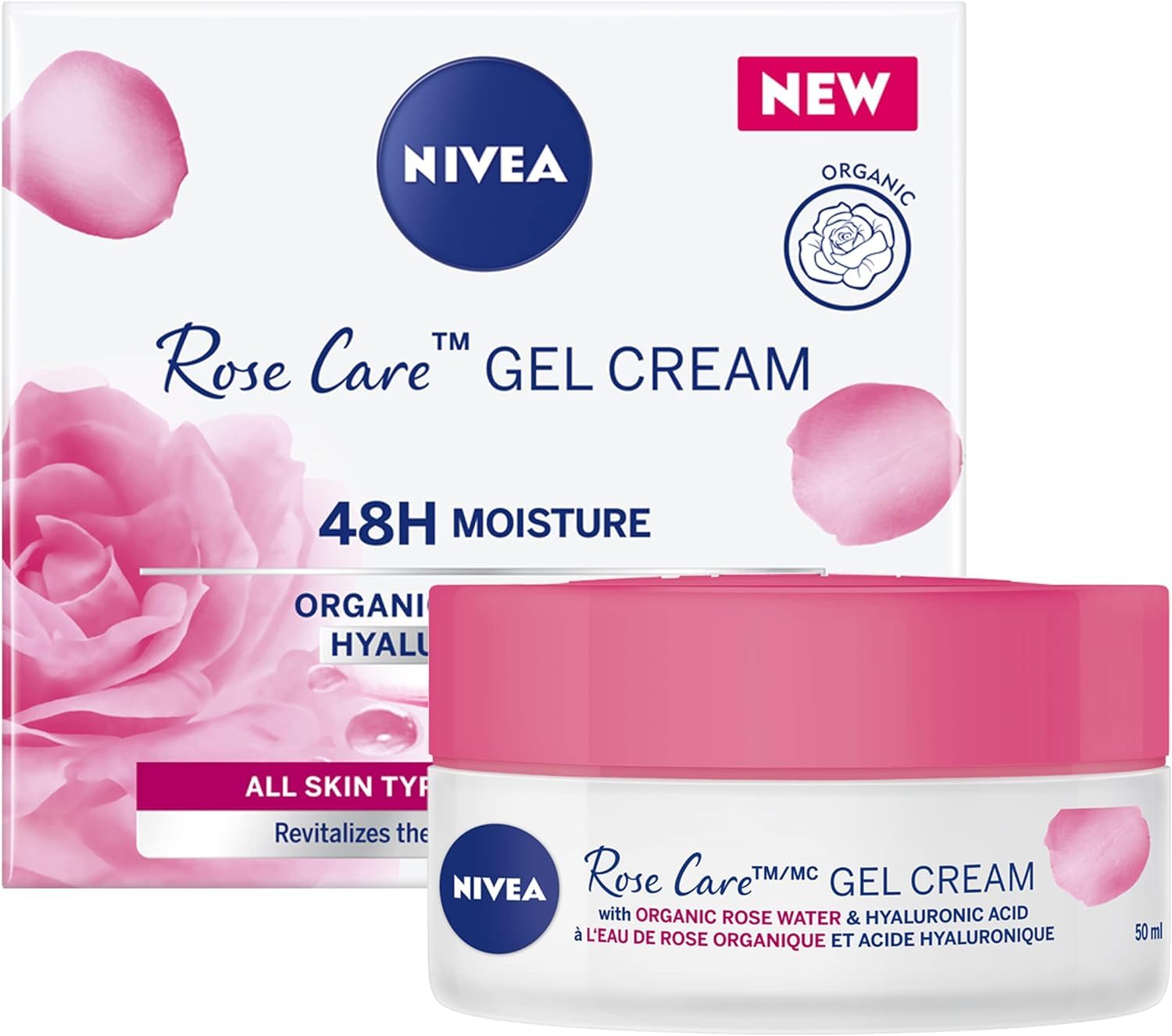 NIVEA Rose Care Gel Cream, 48-Hour Hydrating Face Cream for All Skin Types, Rose Water and Hyaluronic Acid Moisturizer for Face, Dermatologically-Tested Skin Care, 50mL