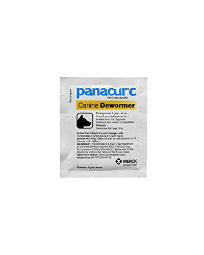 Directions: Instructions: The daily dose for Panacur C is 50 mg/kg (22.7 mg/lb) of body weight. Please refer to the following dosing table for help in finding the right dose for your dog. (10 pounds: 1 gram) (20 pounds: 2 gram) (30 pounds: 1 gram + 2 gram) (40 pounds: 4 gram) (50 pounds: 1 gram + 4 gram) (60 pounds: 2 gram + 4 gram) (80 pounds: Two 4 gram) (Over 80 pounds: Use combinations to obtain recommended daily dose) *Packet size is the daily dose. The dog must be treated with this dose for 3 days in a row. You should weigh your dog to make sure you are using the right size and number of packets. If your dog’s weight is in-between the suggested dosing sizes, it is safe to use the next higher size. For example, a 15-pound dog should be treated with the 2-gram packet. Give Panacur C to your dog by mixing the daily dose with a small amount of the usual food. Make sure your dog eats all of the medicated food. You may need to moisten dry dog food to aid mixing. Repeat the daily dose for three days in a row.