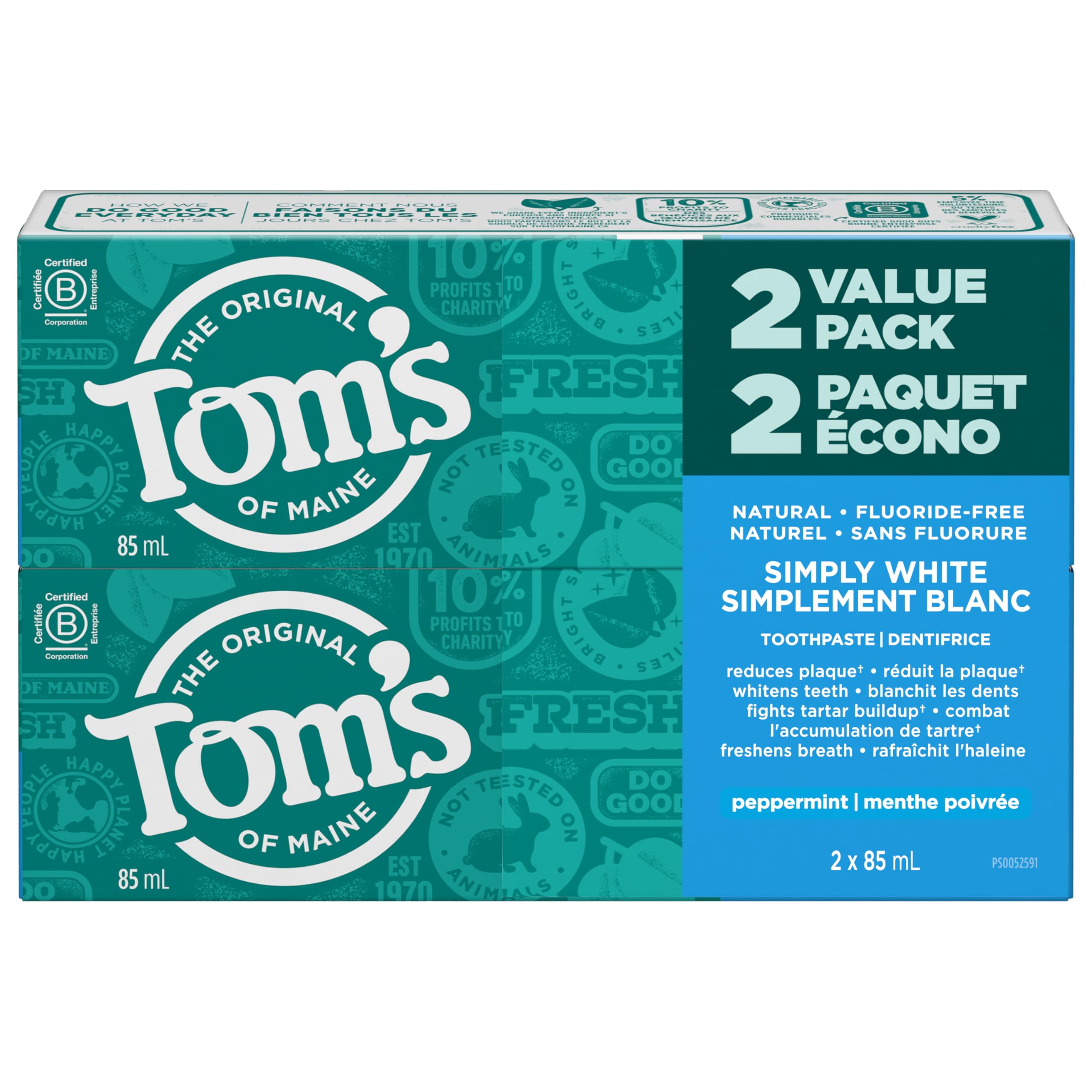 Tom's of Maine Simply White - Refreshing Peppermint - Fluoride-Free Natural Whitening Toothpaste Fights Tarter and Plaque to Whiten Teeth Naturally - 2 Pack, 85 mL