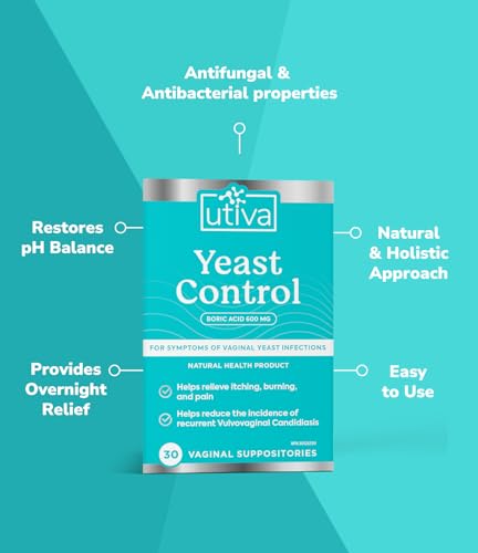 Utiva Yeast Control – Boric Acid Suppositories – pH Balance Feminine Care Suppositories for Women – 600mg Boric Acid Suppositories to Lower pH and Support Vaginal Health, 30 Vaginal Suppositories