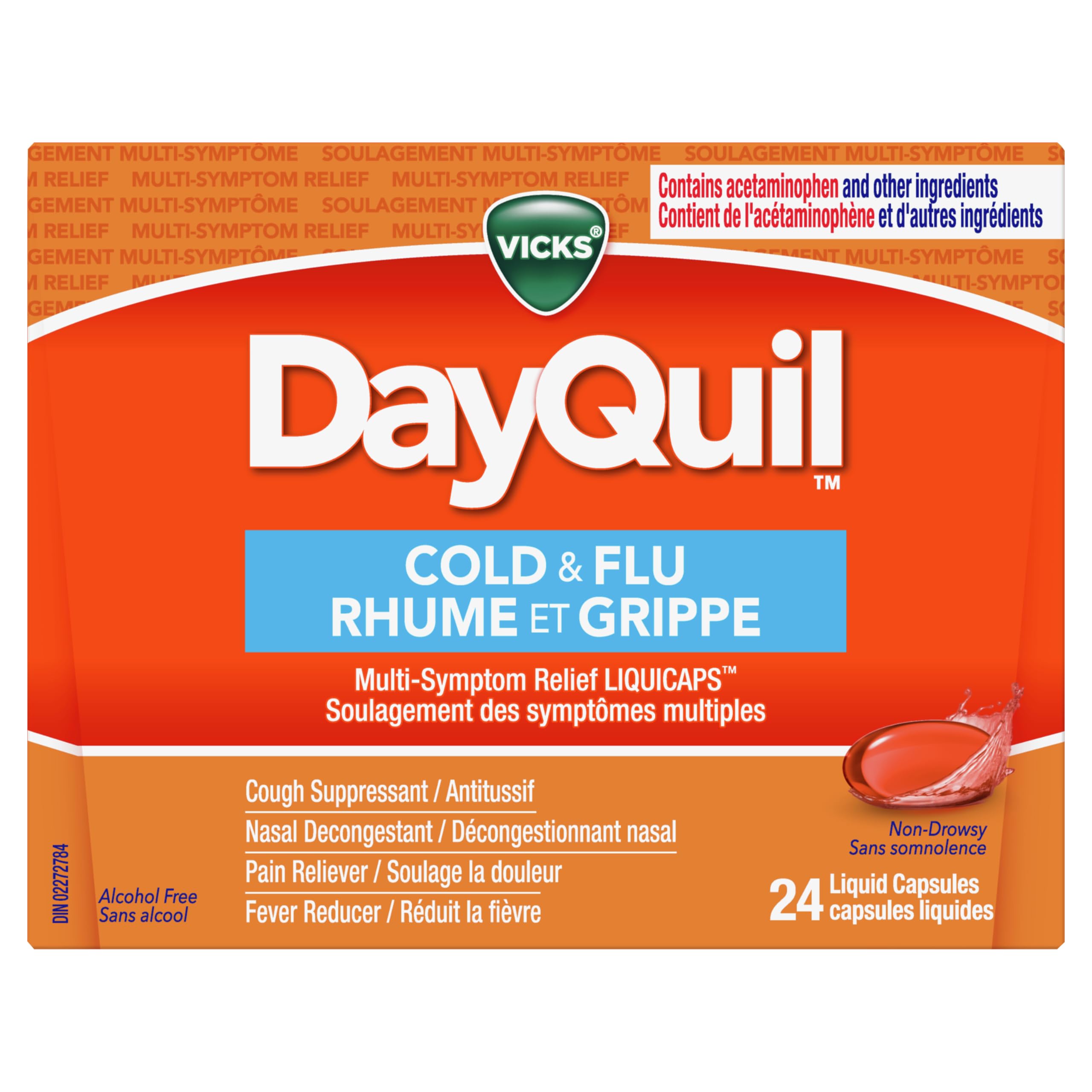 Vicks DayQuil Cold and Flu Medicine, Cough Suppressant, Nasal Decongestant, Pain & Fever Reducer, Non-Drowsy Formula, 24 Liquid Capsules